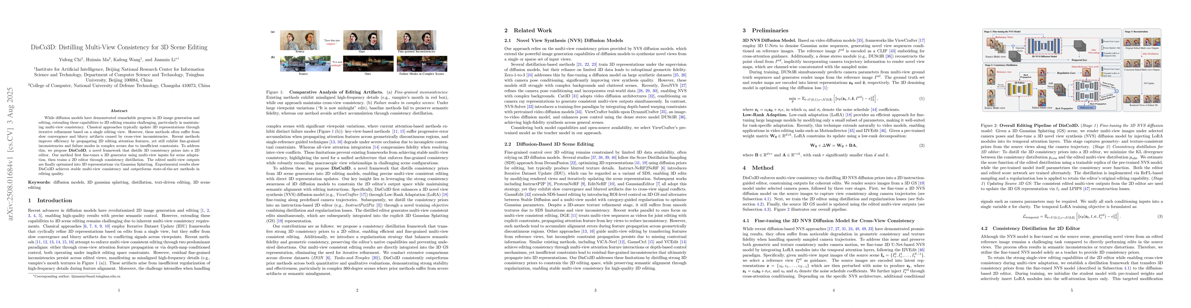 DisCo3D proposes a novel 3D editing framework that distills 3D consistency priors into a 2D editor through fine-tuning a 3D generator with multi-view inputs and consistency distillation. The edited outputs are optimized into 3D representations via Gaussian Splatting.