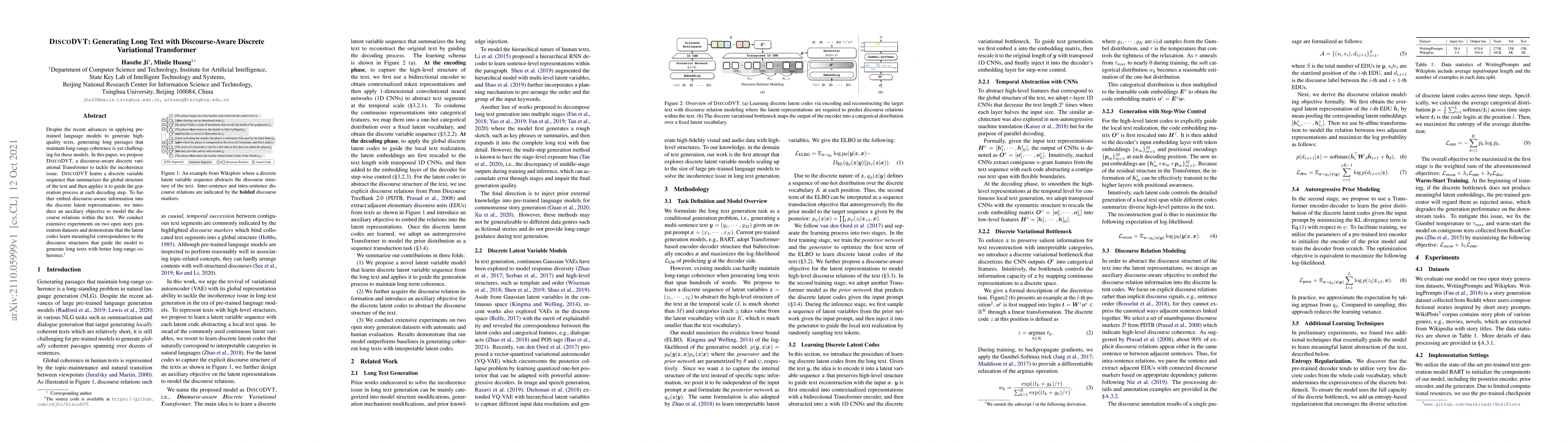 DiscoDVT is a discourse-aware discrete variational Transformer designed to improve long text generation coherence. It employs a discrete variable sequence to summarize text structure and an auxiliary objective to model discourse relations, leading to better long-range coherence in generated long passages.