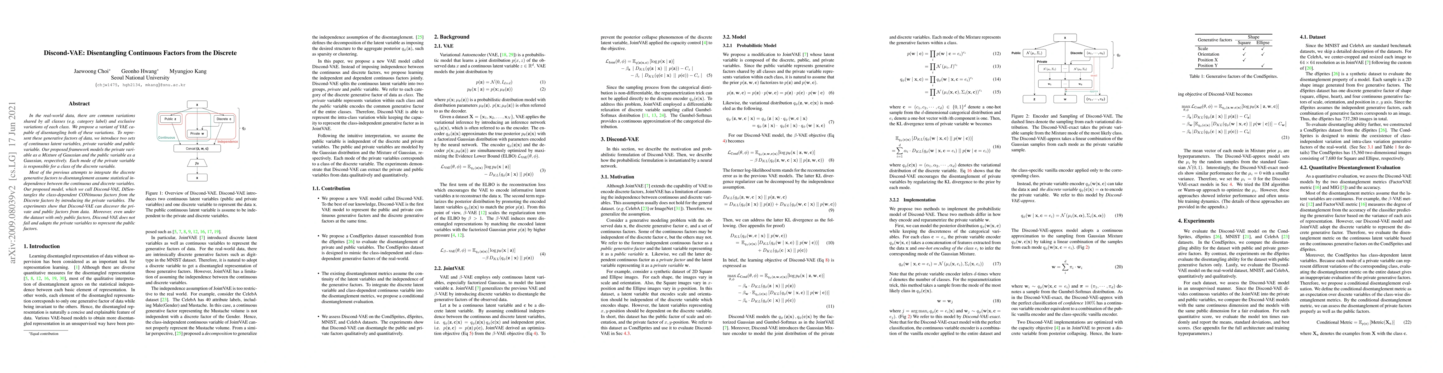 Discond-VAE introduces a new VAE framework that disentangles class-dependent continuous factors from discrete factors in real-world data. It discovers private and public latent variables to model these variations.