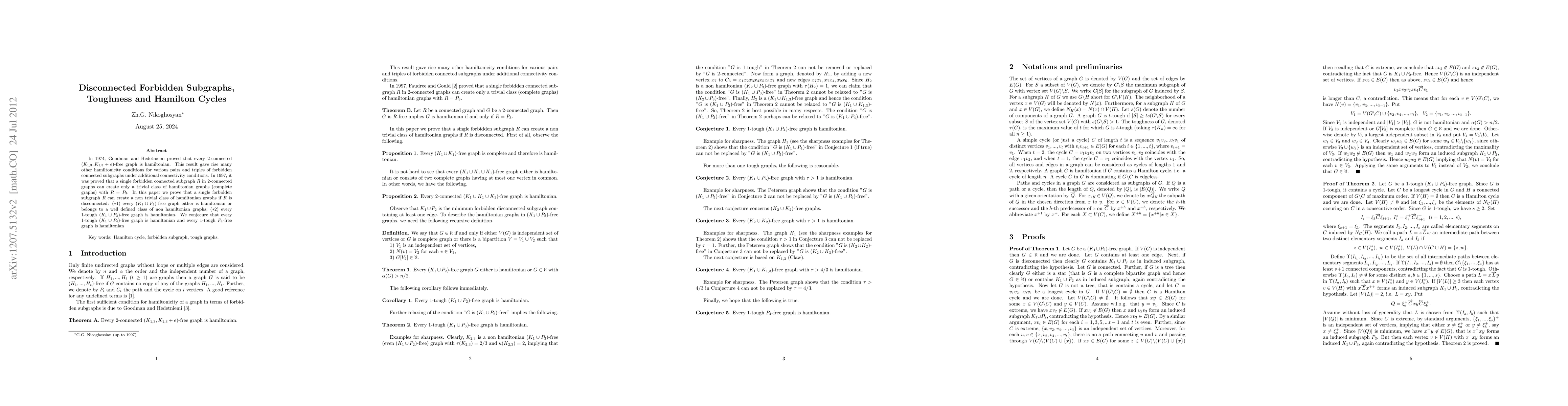 This paper investigates the relationship between disconnected forbidden subgraphs and Hamilton cycles, proving that certain disconnected subgraphs, like $K_1\cup P_2$ and $K_1\cup P_3$, lead to either Hamiltonian graphs or a well-defined class of non-Hamiltonian graphs. The authors conjecture that similar properties hold for $K_1\cup P_4$ and $P_4$-free graphs.