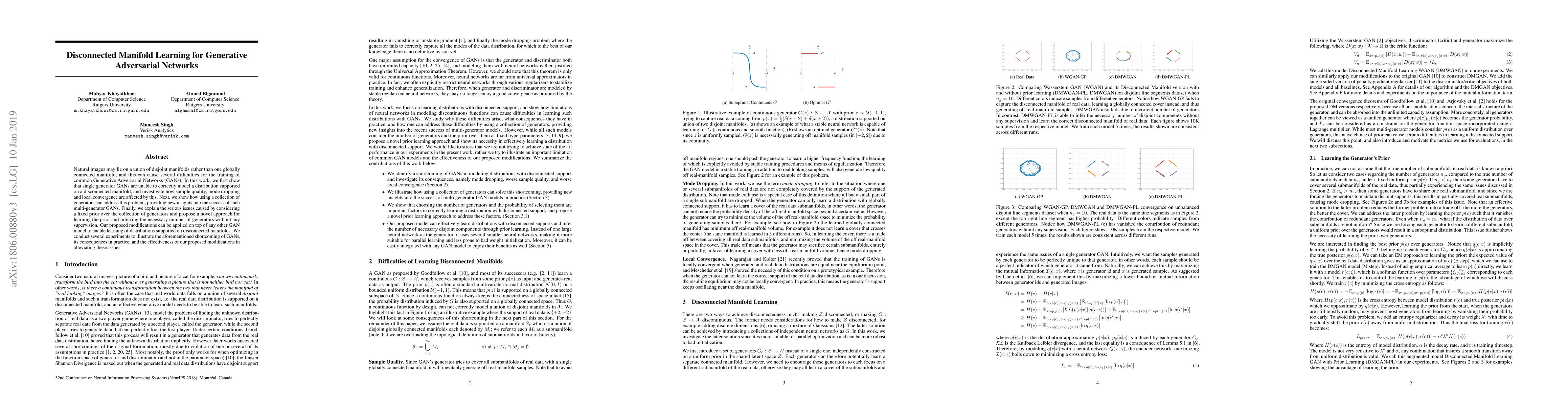 This paper explores the challenges of training GANs with natural images that lie on disconnected manifolds. It proposes a multi-generator approach to address mode dropping and local convergence issues, and introduces a novel method for learning the prior distribution and determining the number of generators without supervision.