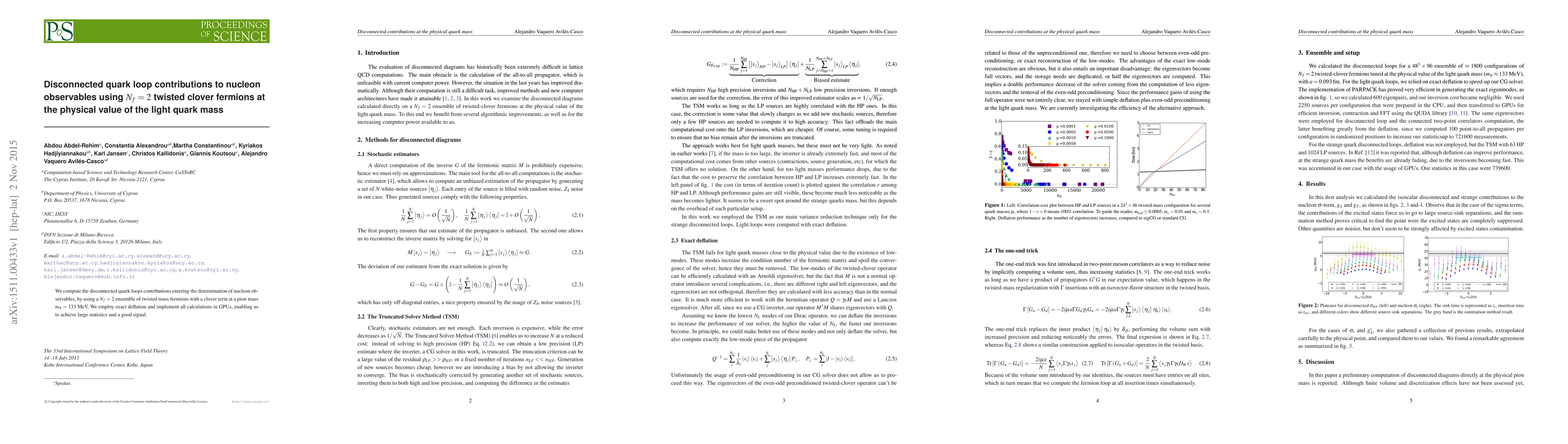 We compute the disconnected quark loops contributions entering the determination of nucleon observables, by using a $N_f = 2$ ensemble of twisted mass fermions with a clover term at a pion mass $m_\pi = 133$ MeV. We employ exact deflation and implement all calculations in GPUs, enabling us to achieve large statistics and a good signal.