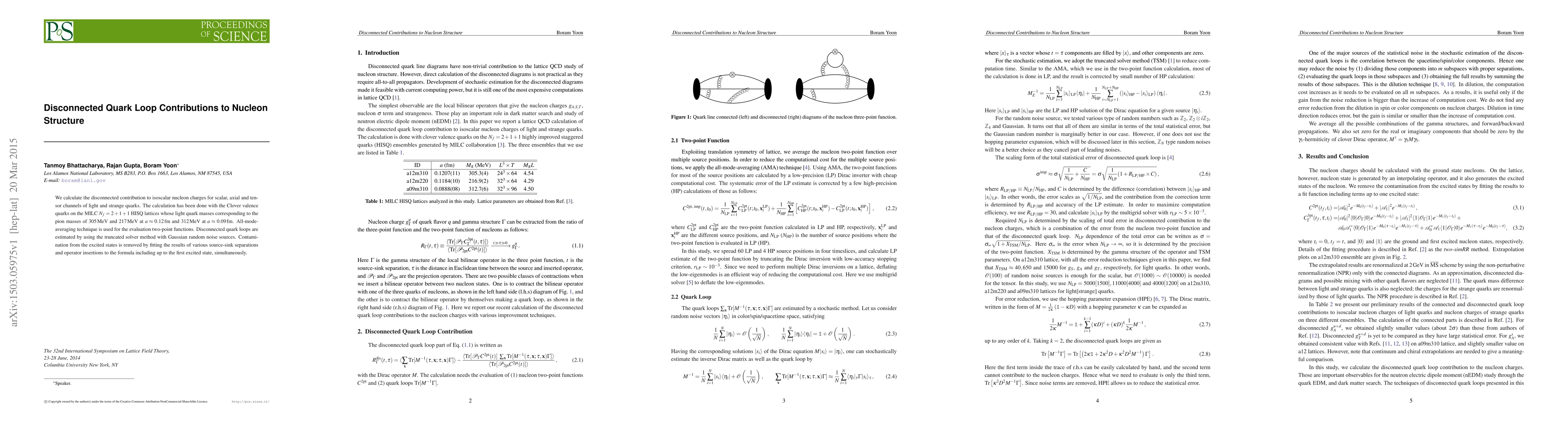 We calculate the disconnected contribution to isoscalar nucleon charges for scalar, axial and tensor channels of light and strange quarks. The calculation has been done with the Clover valence quarks on the MILC $N_f=2+1+1$ HISQ lattices whose light quark masses corresponding to the pion masses of 305 MeV and 217 MeV at $a \approx 0.12$ fm and 312 MeV at $a \approx 0.09$ fm. All-mode-averaging technique is used for the evaluation two-point functions. Disconnected quark loops are estimated by using the truncated solver method with Gaussian random noise sources. Contamination from the excited states is removed by fitting the results of various source-sink separations and operator insertions to the formula including up to the first excited state, simultaneously.