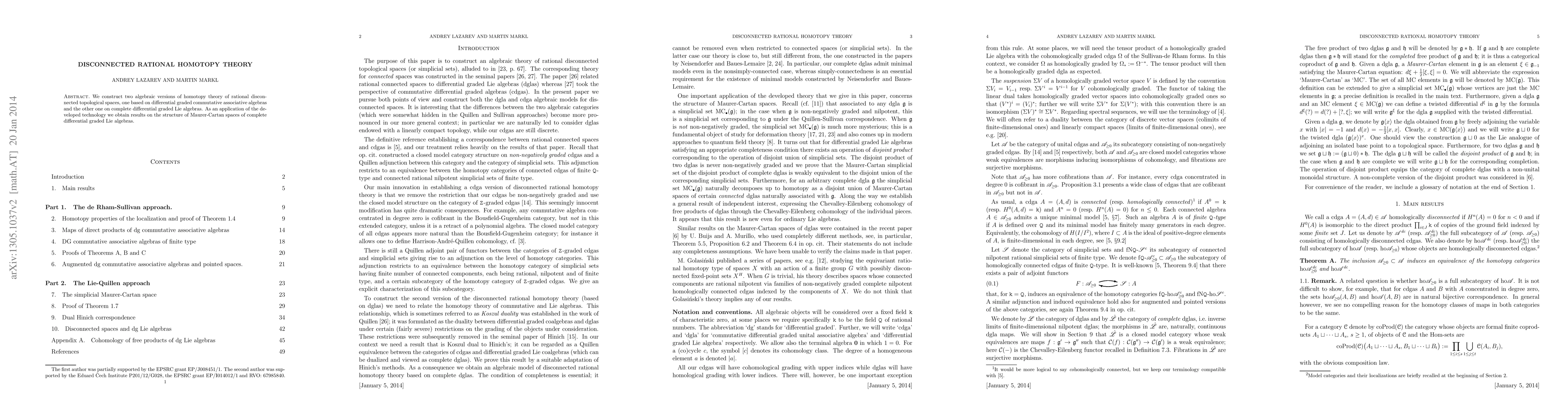 The paper constructs two algebraic versions of homotopy theory for rational disconnected topological spaces, utilizing differential graded commutative associative algebras and complete differential graded Lie algebras.