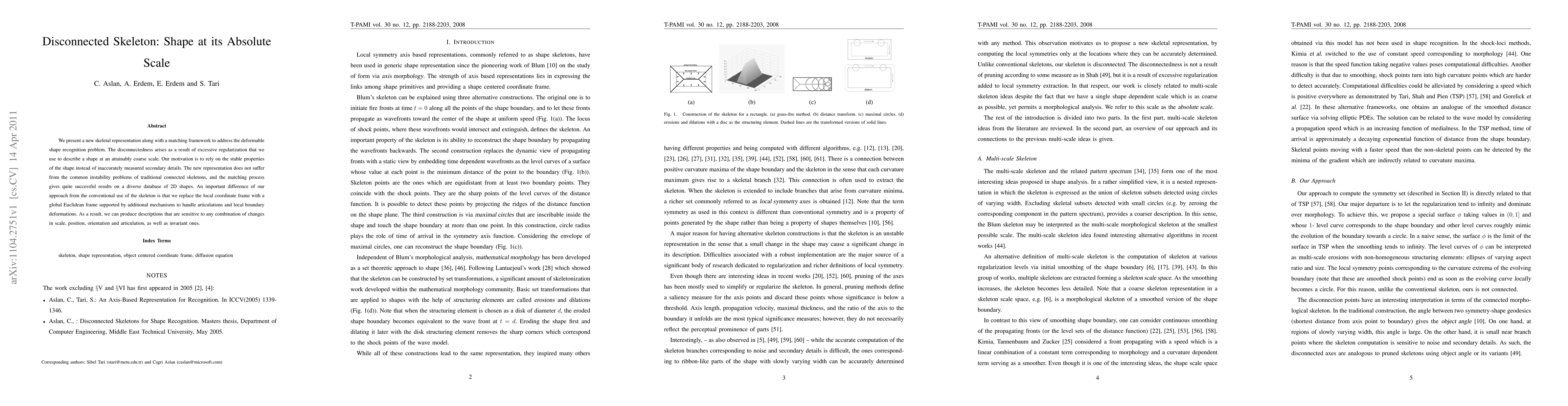 We present a new skeletal representation along with a matching framework to address the deformable shape recognition problem. The disconnectedness arises as a result of excessive regularization that we use to describe a shape at an attainably coarse scale. Our motivation is to rely on the stable properties of the shape instead of inaccurately measured secondary details. The new representation does not suffer from the common instability problems of traditional connected skeletons, and the matching process gives quite successful results on a diverse database of 2D shapes. An important difference of our approach from the conventional use of the skeleton is that we replace the local coordinate frame with a global Euclidean frame supported by additional mechanisms to handle articulations and local boundary deformations. As a result, we can produce descriptions that are sensitive to any combination of changes in scale, position, orientation and articulation, as well as invariant ones.