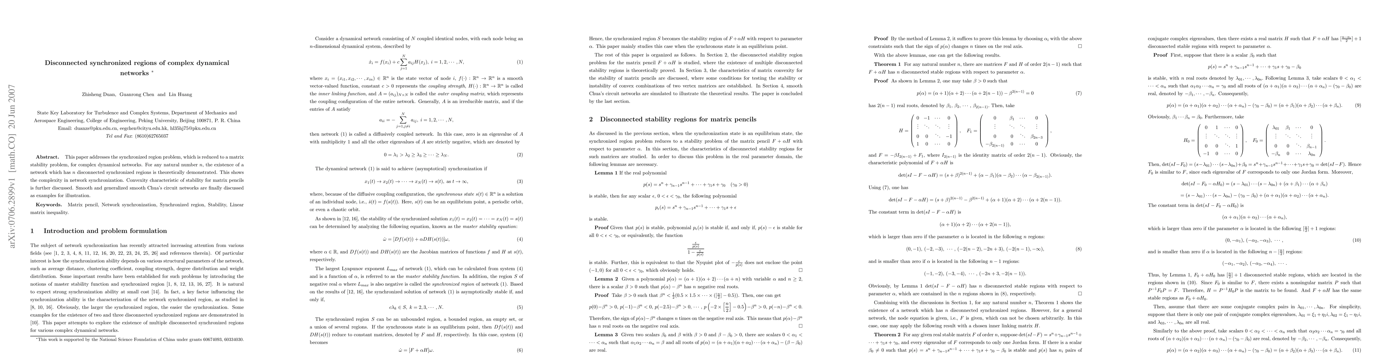 The paper presents a novel approach to understanding and proving the existence of disconnected synchronized regions in complex dynamical networks, linking it to matrix stability problems.