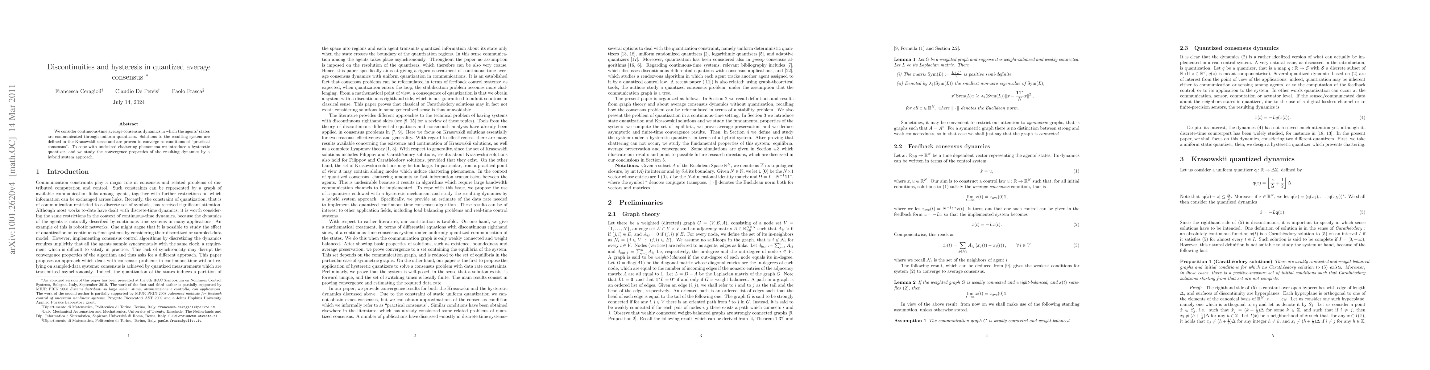 This paper investigates continuous-time average consensus dynamics with quantized communication, showing convergence to practical consensus despite chattering. It introduces a hysteretic quantizer to mitigate chattering and analyzes the convergence properties using a hybrid system approach.