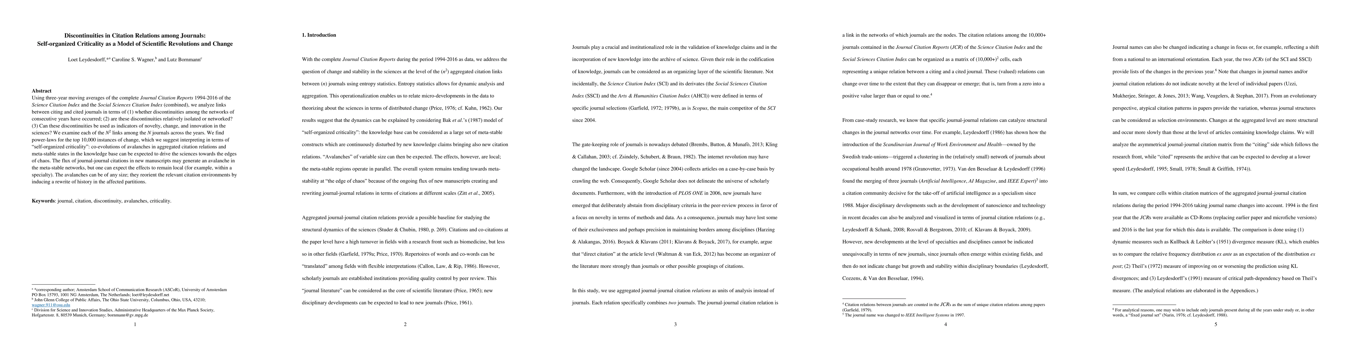 This study analyzes citation patterns in scientific journals from 1994-2016, finding power-law distributions indicating 'self-organized criticality'. Disruptions in citation networks resemble scientific revolutions, with localized yet potentially transformative effects, reshaping citation environments like avalanches in a system near chaos.