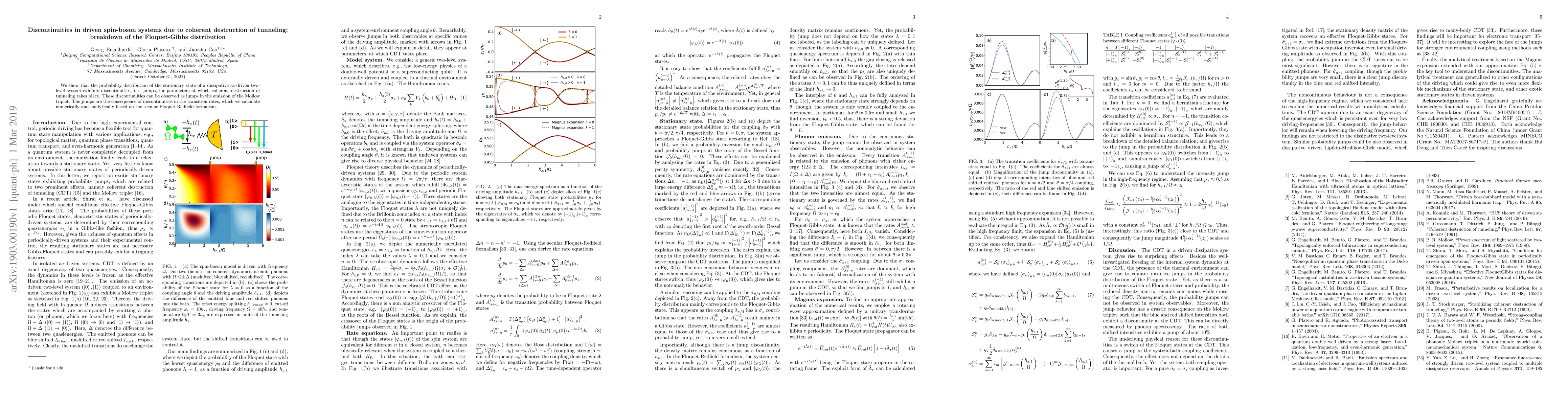 This paper demonstrates that discontinuities in the stationary state probability distribution of a dissipative ac-driven two-level system occur due to coherent destruction of tunneling, leading to observable jumps in the Mollow triplet emission. These jumps arise from calculated discontinuities in transition rates using the secular Floquet-Redfield formalism.