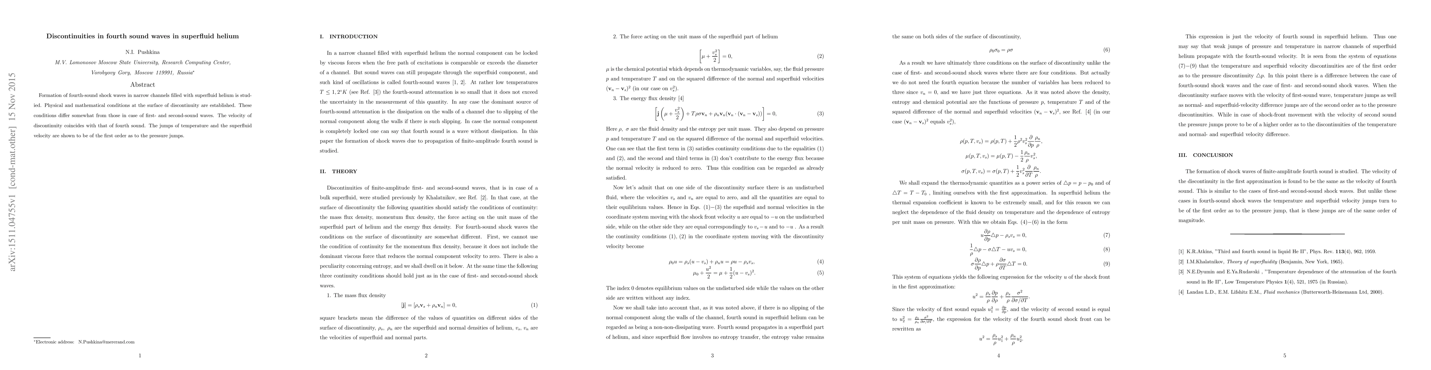 The study investigates fourth-sound shock waves in narrow channels of superfluid helium, establishing unique physical and mathematical conditions at discontinuities that differ from first- and second-sound waves, with the discontinuity velocity matching that of fourth sound, and first-order jumps in temperature and superfluid velocity relative to pressure jumps.