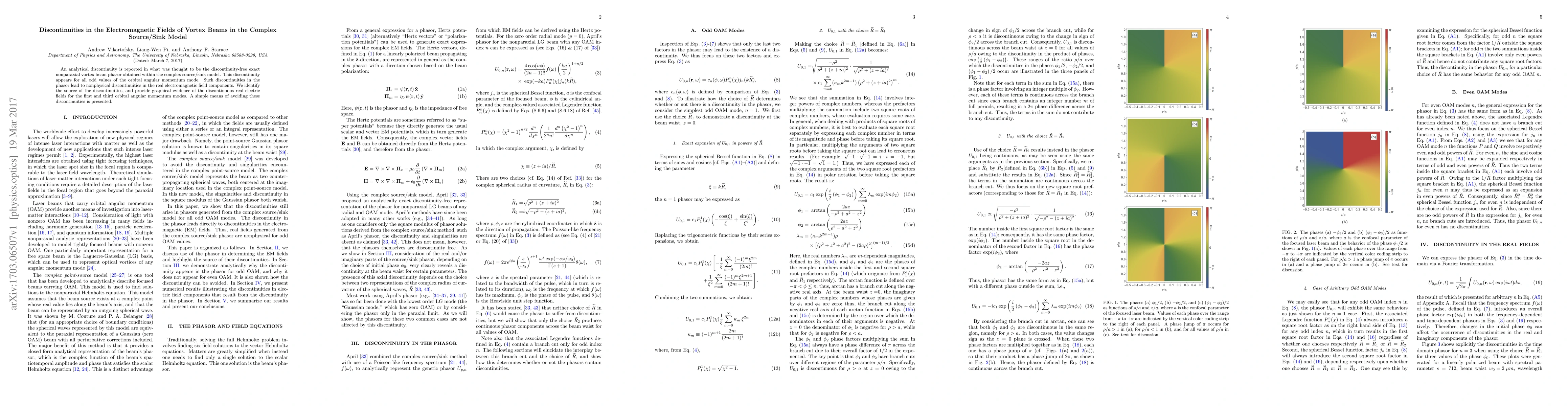 An analytical discontinuity is reported in what was thought to be the discontinuity-free exact nonparaxial vortex beam phasor obtained within the complex source/sink model. This discontinuity appears for all odd values of the orbital angular momentum mode. Such discontinuities in the phasor lead to nonphysical discontinuities in the real electromagnetic field components. We identify the source of the discontinuities, and provide graphical evidence of the discontinuous real electric fields for the first and third orbital angular momentum modes. A simple means of avoiding these discontinuities is presented.