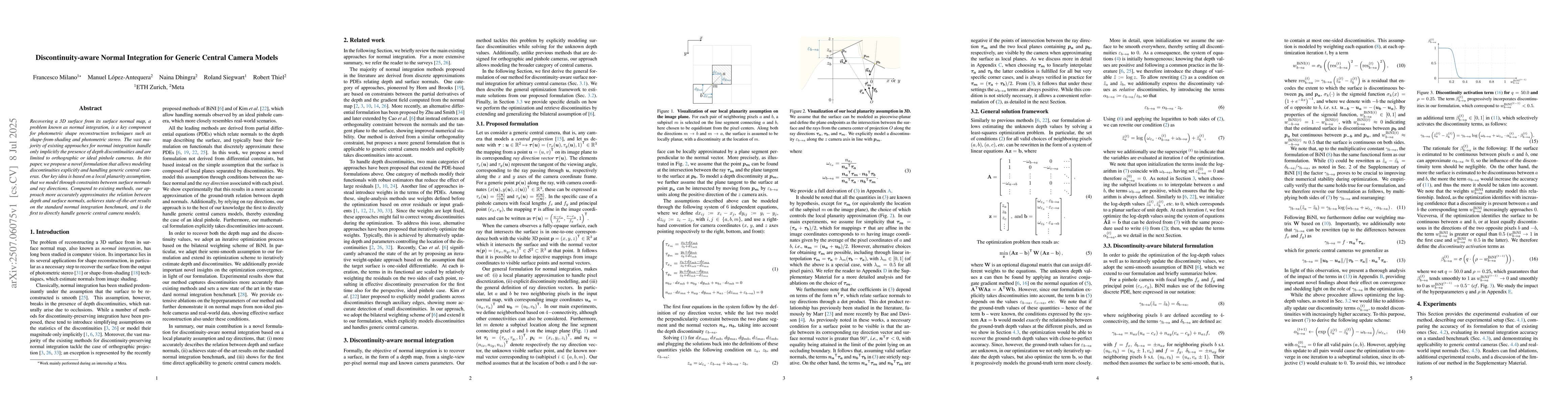 Recovering a 3D surface from its surface normal map, a problem known as normal integration, is a key component for photometric shape reconstruction techniques such as shape-from-shading and photometric stereo. The vast majority of existing approaches for normal integration handle only implicitly the presence of depth discontinuities and are limited to orthographic or ideal pinhole cameras. In this paper, we propose a novel formulation that allows modeling discontinuities explicitly and handling generic central cameras. Our key idea is based on a local planarity assumption, that we model through constraints between surface normals and ray directions. Compared to existing methods, our approach more accurately approximates the relation between depth and surface normals, achieves state-of-the-art results on the standard normal integration benchmark, and is the first to directly handle generic central camera models.