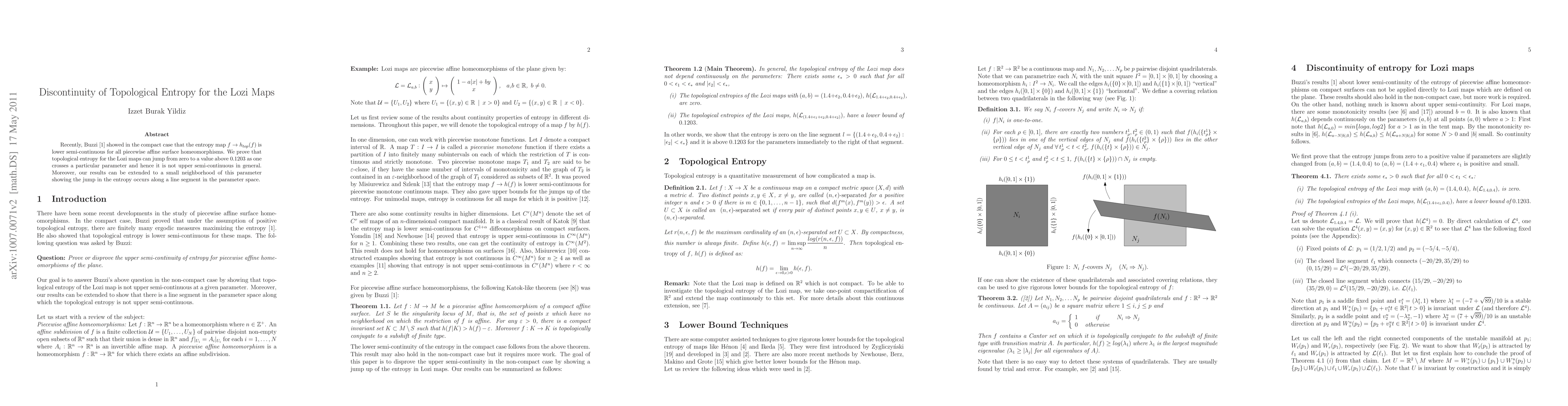 Recently, Buzzi showed in the compact case that the entropy map $f\rightarrow$ $h_{top}(f)$ is lower semi-continuous for all piecewise affine surface homeomorphisms. We prove that topological entropy for the Lozi maps can jump from zero to a value above 0.1203 as one crosses a particular parameter and hence it is not upper semi-continuous in general. Moreover, our results can be extended to a small neighborhood of this parameter showing the jump in the entropy occurs along a line segment in the parameter space.