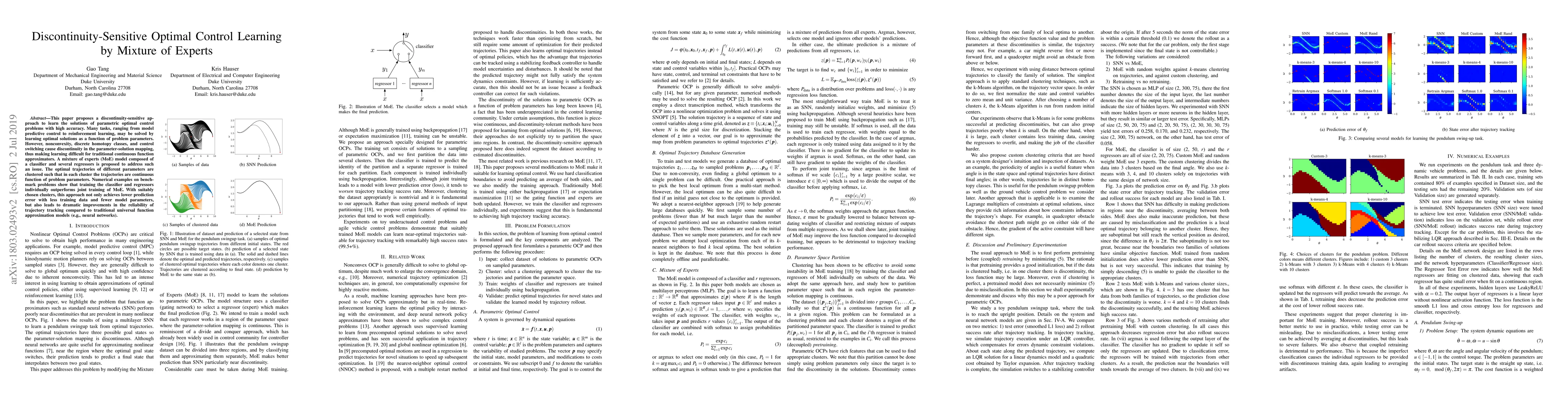 This paper proposes a discontinuity-sensitive mixture of experts model for learning optimal control solutions, addressing the challenges posed by nonconvexity and parameter-induced discontinuities. The approach clusters optimal trajectories and trains classifiers and regressors separately, achieving lower prediction error and better reliability compared to traditional models.