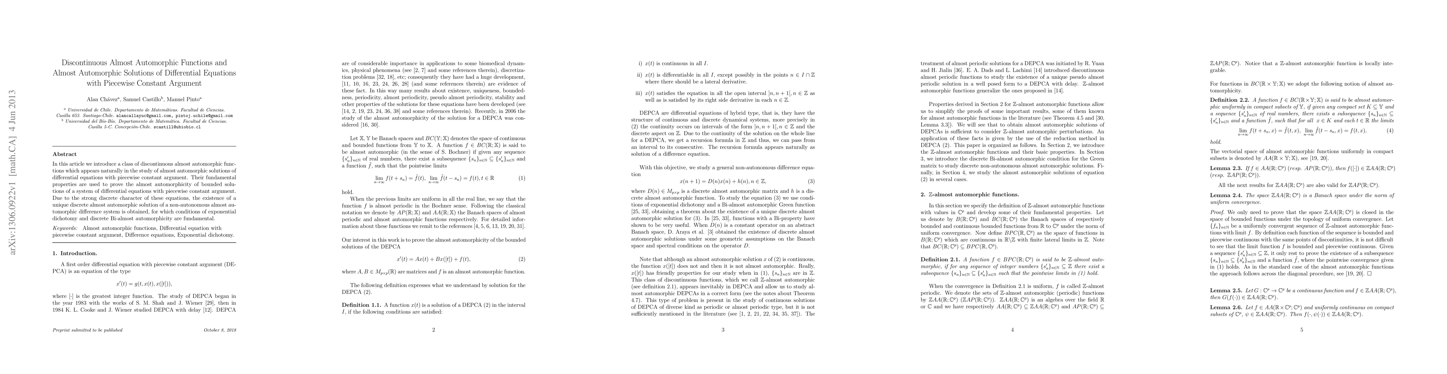 This paper introduces a new class of discontinuous almost automorphic functions relevant to differential equations with piecewise constant arguments. It proves the almost automorphicity of bounded solutions for such systems, establishing a unique discrete almost automorphic solution for non-autonomous difference systems under conditions of exponential dichotomy and discrete Bi-almost automorphicity.