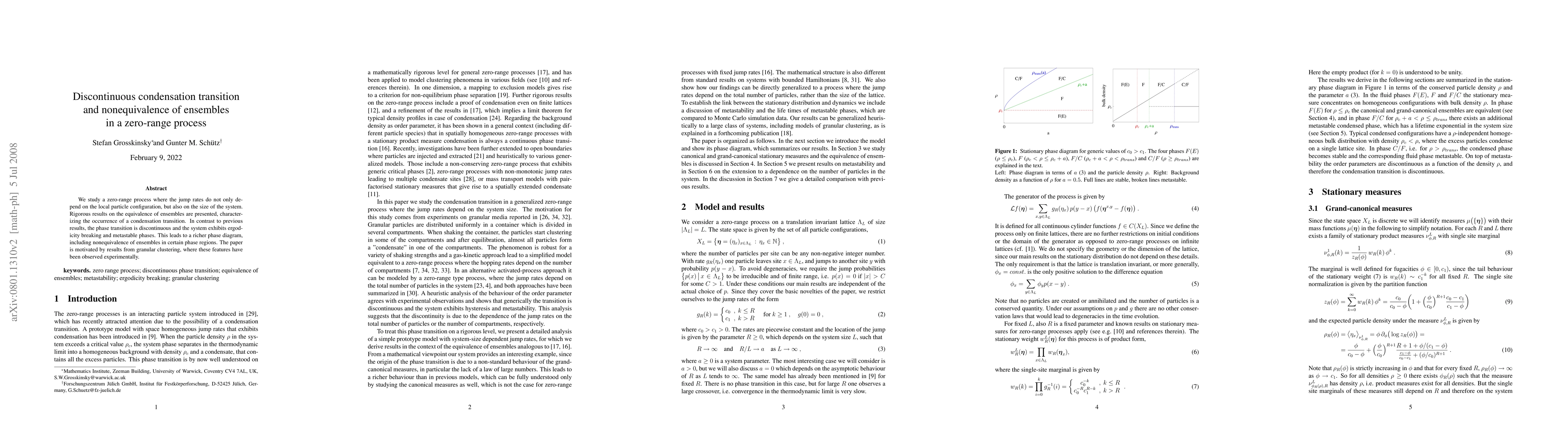 This research investigates a zero-range process where jump rates depend on both local particle configurations and system size, revealing a discontinuous condensation transition, ergodicity breaking, and metastable phases, leading to nonequivalence of ensembles in certain regions. This study extends understanding of granular clustering phenomena observed experimentally.