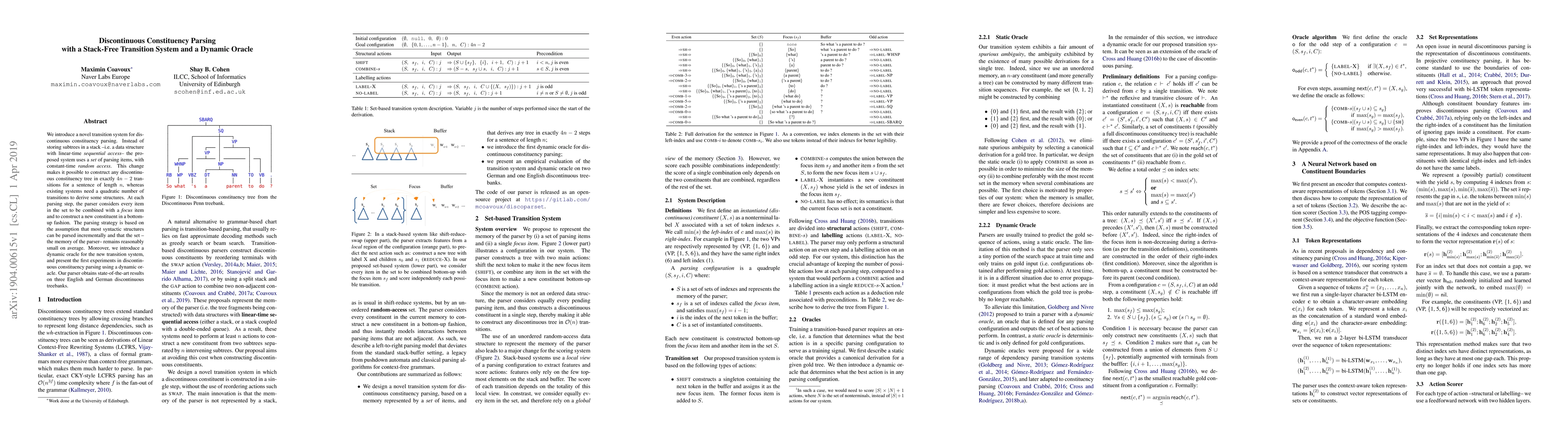 This paper proposes a stack-free transition system for parsing discontinuous constituency structures using parsing items with constant-time access, achieving parsing in $4n - 2$ transitions. The system employs a dynamic oracle and achieves state-of-the-art results on English and German treebanks.
