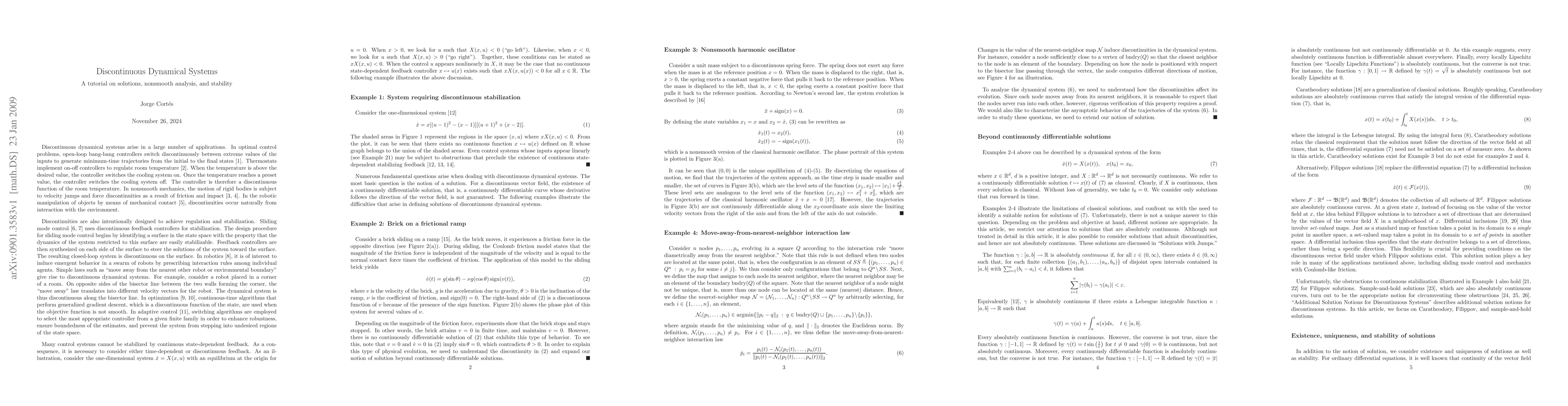 This paper examines discontinuous dynamical systems, focusing on solution definitions and stability analysis. It discusses various solution concepts and stability methods, including Lyapunov functions and the LaSalle Invariance Principle, and applies these to nonsmooth gradient flows.