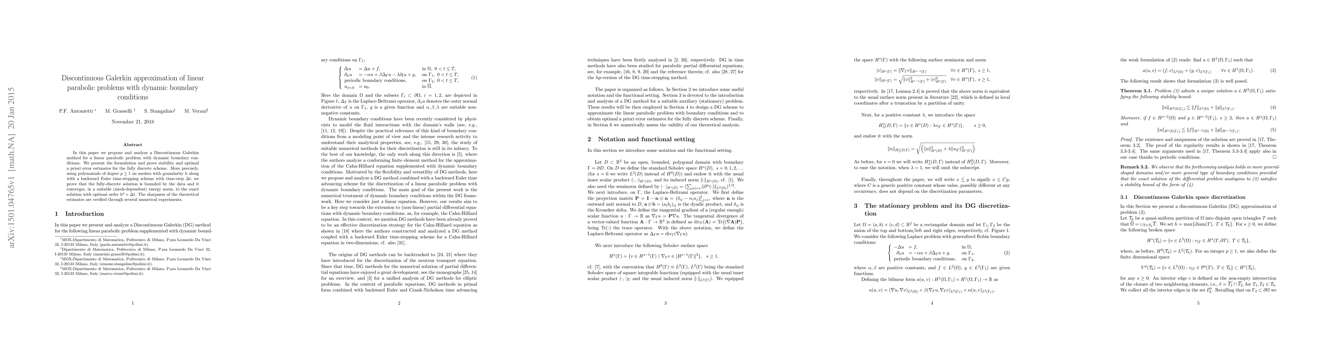 This paper proposes a Discontinuous Galerkin method for linear parabolic problems with dynamic boundary conditions, proving stability and optimal a priori error estimates. Numerical experiments confirm the theoretical convergence rate of $h^p + \Delta t$ for the fully discrete scheme.