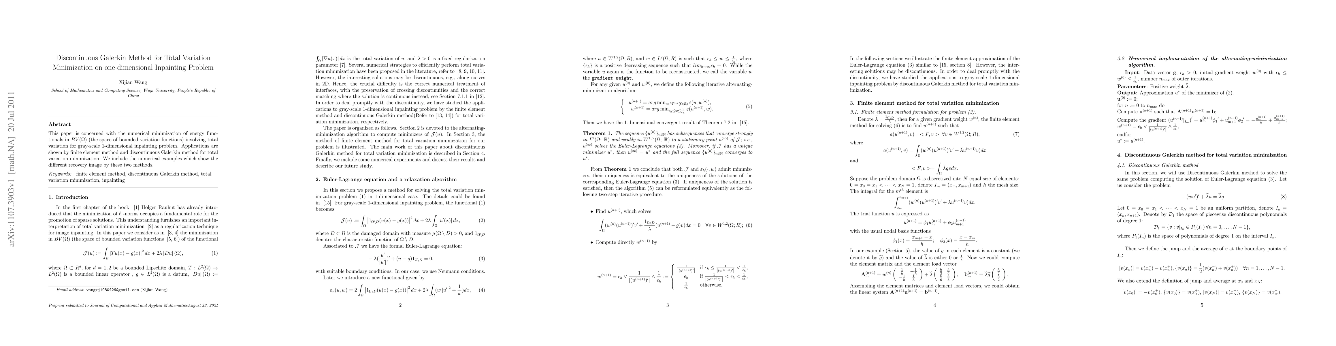This paper explores the application of discontinuous Galerkin methods for minimizing total variation in the context of 1-dimensional inpainting problems. It compares the results of this approach with those obtained using the finite element method, demonstrating distinct image recovery outcomes.