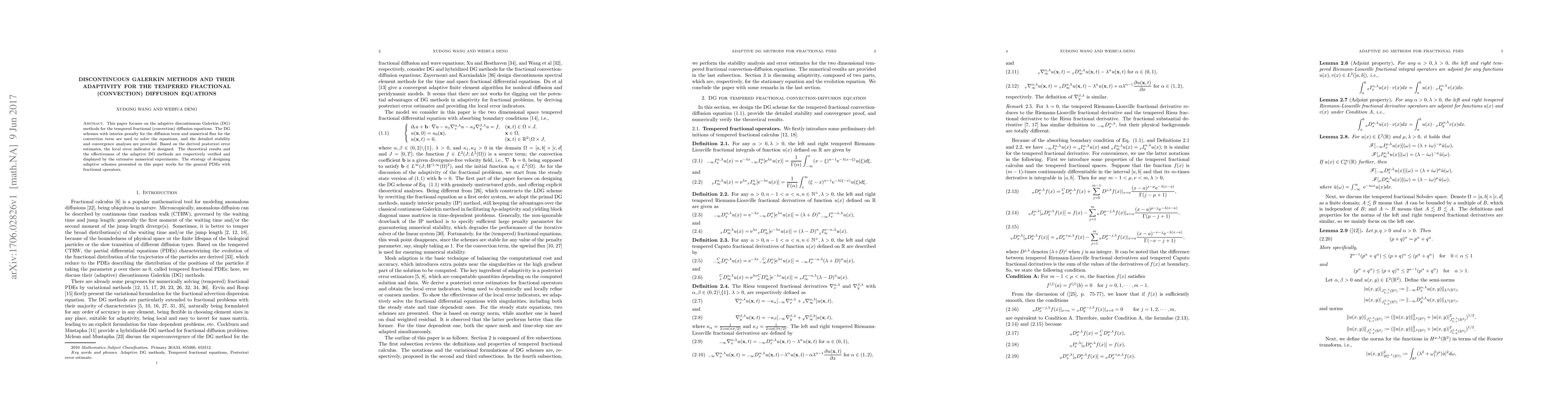 This paper develops adaptive discontinuous Galerkin methods for solving tempered fractional convection diffusion equations, providing stability and convergence analyses, and demonstrating the effectiveness through numerical experiments. The adaptive scheme is shown to be effective for general PDEs with fractional operators.