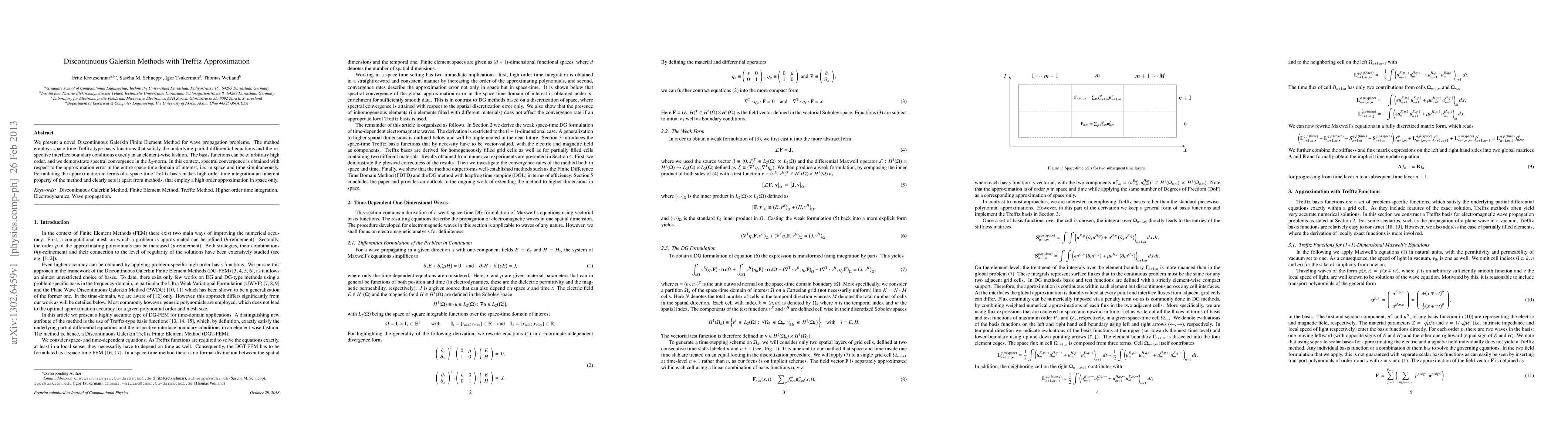 This paper introduces a Discontinuous Galerkin Finite Element Method using space-time Trefftz-type basis functions for wave propagation problems, achieving exact satisfaction of PDEs and boundary conditions. The method demonstrates spectral convergence in the $\Lebesgue_2$-norm, highlighting its high-order time integration capability.