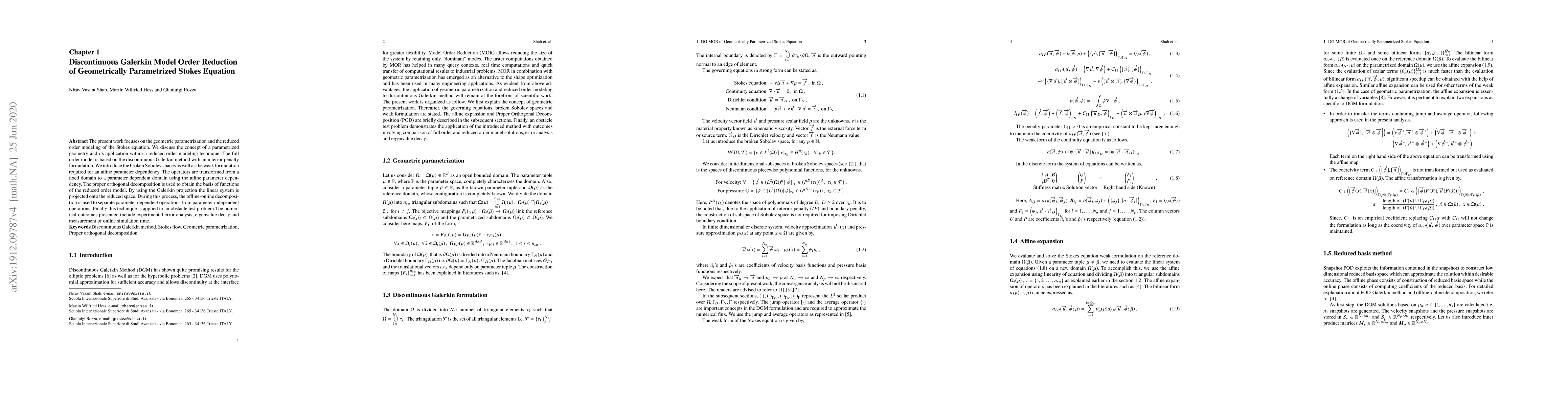 The present work focuses on the geometric parametrization and the reduced order modeling of the Stokes equation. We discuss the concept of a parametrized geometry and its application within a reduced order modeling technique. The full order model is based on the discontinuous Galerkin method with an interior penalty formulation. We introduce the broken Sobolev spaces as well as the weak formulation required for an affine parameter dependency. The operators are transformed from a fixed domain to a parameter dependent domain using the affine parameter dependency. The proper orthogonal decomposition is used to obtain the basis of functions of the reduced order model. By using the Galerkin projection the linear system is projected onto the reduced space. During this process, the offline-online decomposition is used to separate parameter dependent operations from parameter independent operations. Finally this technique is applied to an obstacle test problem.The numerical outcomes presented include experimental error analysis, eigenvalue decay and measurement of online simulation time. Keywords: Discontinuous Galerkin method, Stokes flow, Geometric parametrization, Proper orthogonal decomposition