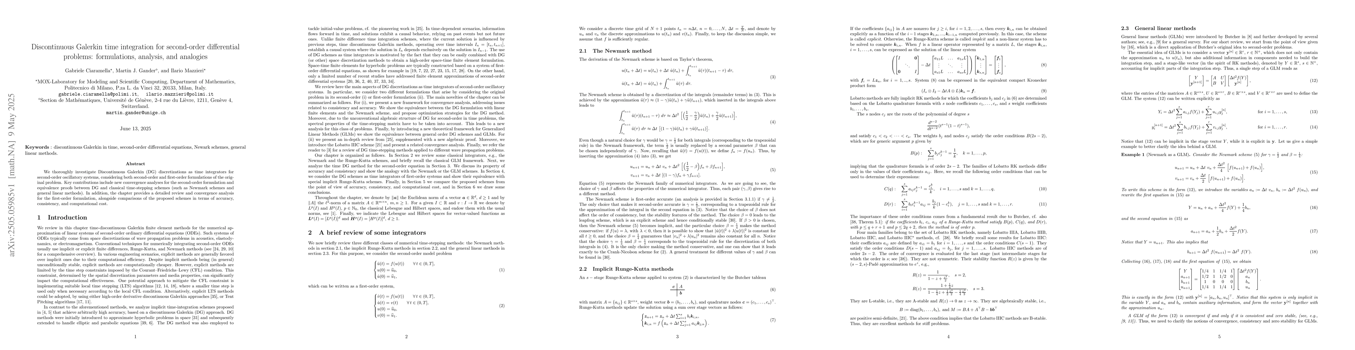 The paper presents novel equivalence proofs between Discontinuous Galerkin methods and classical time-stepping schemes, along with new convergence analyses for second-order formulations.