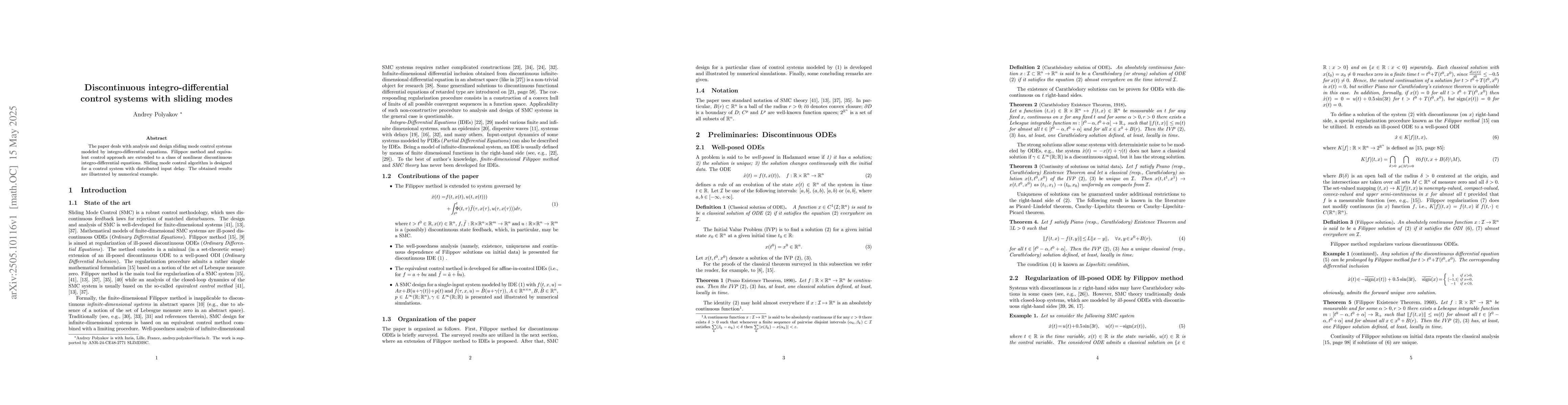 The extension of Filippov method and equivalent control approach to discontinuous integro-differential equations for sliding mode control design.