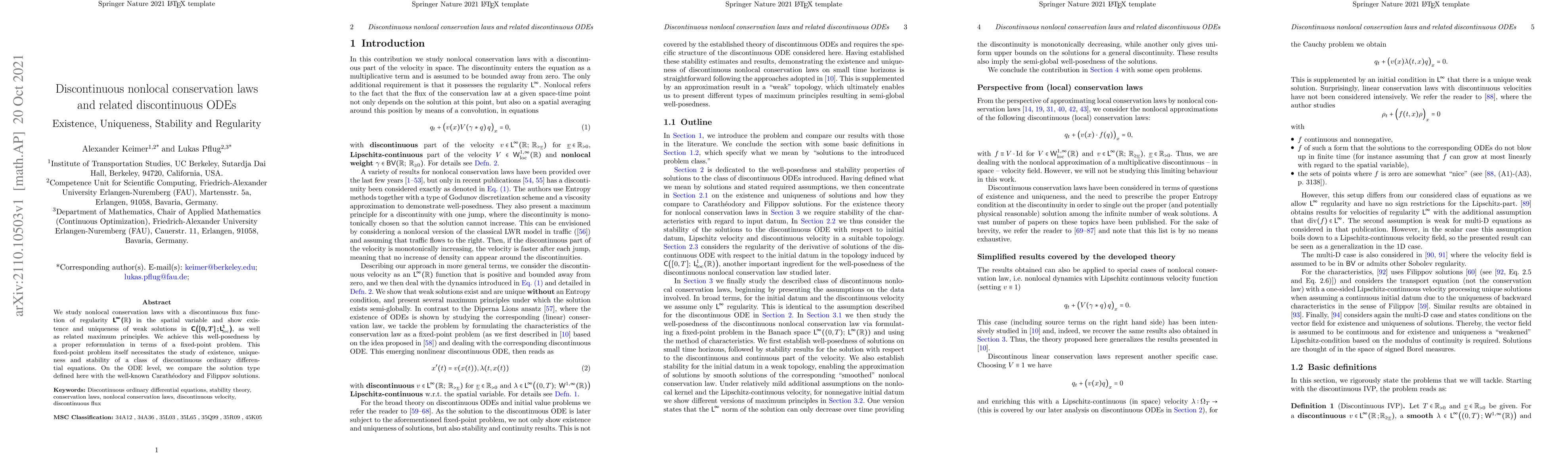 We study nonlocal conservation laws with a discontinuous flux function of regularity $\mathsf{L}^{\infty}(\mathbb{R})$ in the spatial variable and show existence and uniqueness of weak solutions in $\mathsf{C}\big([0,T];\mathsf{L}^{1}_{\text{loc}}(\mathbb{R})\big)$, as well as related maximum principles. We achieve this well-posedness by a proper reformulation in terms of a fixed-point problem. This fixed-point problem itself necessitates the study of existence, uniqueness and stability of a class of discontinuous ordinary differential equations. On the ODE level, we compare the solution type defined here with the well-known Carath\'eodory and Filippov solutions.