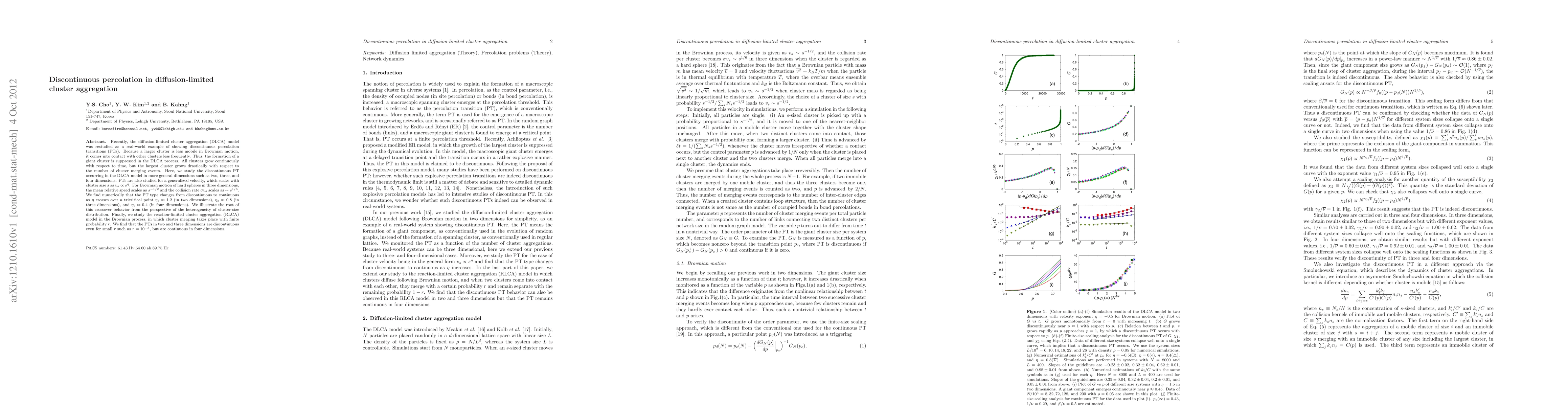 Recently, the diffusion-limited cluster aggregation (DLCA) model was restudied as a real-world example of showing discontinuous percolation transitions (PTs). Because a larger cluster is less mobile in Brownian motion, it comes into contact with other clusters less frequently. Thus, the formation of a giant cluster is suppressed in the DLCA process. All clusters grow continuously with respect to time, but the largest cluster grows drastically with respect to the number of cluster merging events. Here, we study the discontinuous PT occurring in the DLCA model in more general dimensions such as two, three, and four dimensions. PTs are also studied for a generalized velocity, which scales with cluster size $s$ as $v_{s} \propto s^{\eta}$. For Brownian motion of hard spheres in three dimensions, the mean relative speed scales as $s^{-1/2}$ and the collision rate $\sigma v_s$ scales as $\sim s^{1/6}$. We find numerically that the PT type changes from discontinuous to continuous as $\eta$ crosses over a tricritical point $\eta_{c} \approx 1.2$ (in two dimensions), $\eta_{c} \approx 0.8$ (in three dimensions), and $\eta_{c} \approx 0.4$ (in four dimensions). We illustrate the root of this crossover behavior from the perspective of the heterogeneity of cluster-size distribution. Finally, we study the reaction-limited cluster aggregation (RLCA) model in the Brownian process, in which cluster merging takes place with finite probability $r$. We find that the PTs in two and three dimensions are discontinuous even for small $r$ such as $r=10^{-3}$, but are continuous in four dimensions.