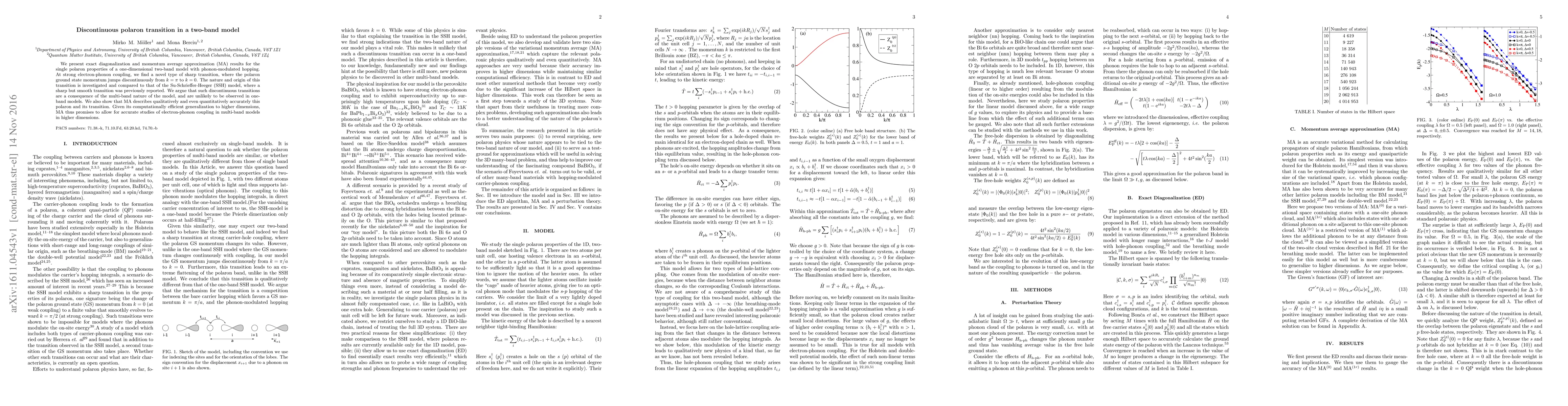 We present exact diagonalization and momentum average approximation (MA) results for the single polaron properties of a one-dimensional two-band model with phonon-modulated hopping. At strong electron-phonon coupling, we find a novel type of sharp transition, where the polaron ground state momentum jumps discontinuously from $k=\pi$ to $k=0$. The nature and origin of this transition is investigated and compared to that of the Su-Schrieffer-Heeger (SSH) model, where a sharp but smooth transition was previously reported. We argue that such discontinuous transitions are a consequence of the multi-band nature of the model, and are unlikely to be observed in one-band models. We also show that MA describes qualitatively and even quantitatively accurately this polaron and its transition. Given its computationally efficient generalization to higher dimensions, MA thus promises to allow for accurate studies of electron-phonon coupling in multi-band models in higher dimensions.