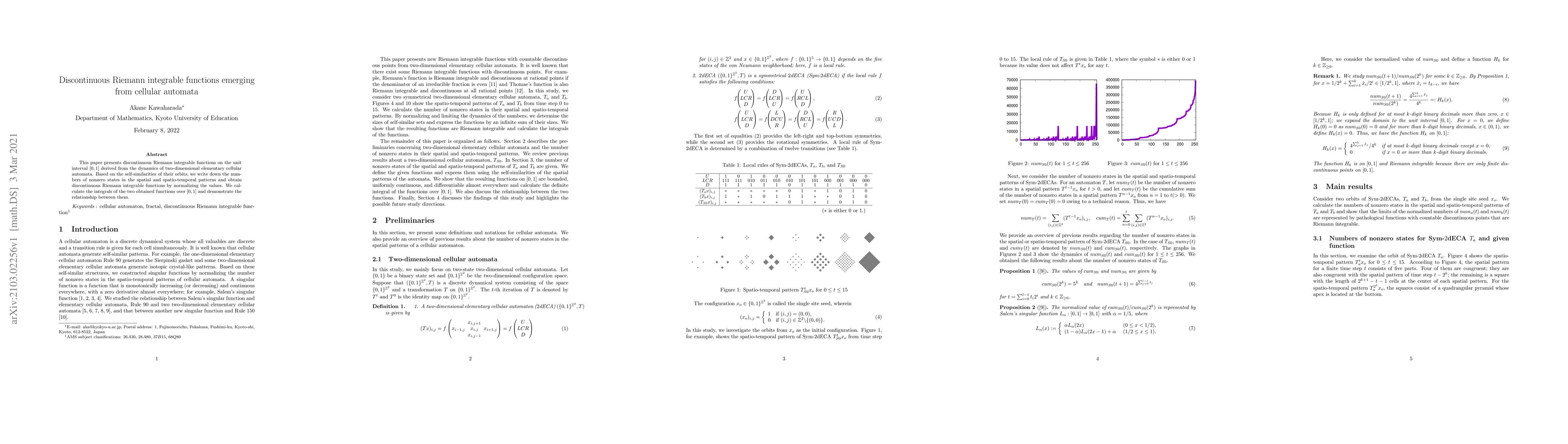 This paper derives discontinuous Riemann integrable functions from the dynamics of two-dimensional elementary cellular automata, showing their self-similarities and calculating their integrals over $[0, 1]$. It demonstrates a relationship between the two obtained functions.