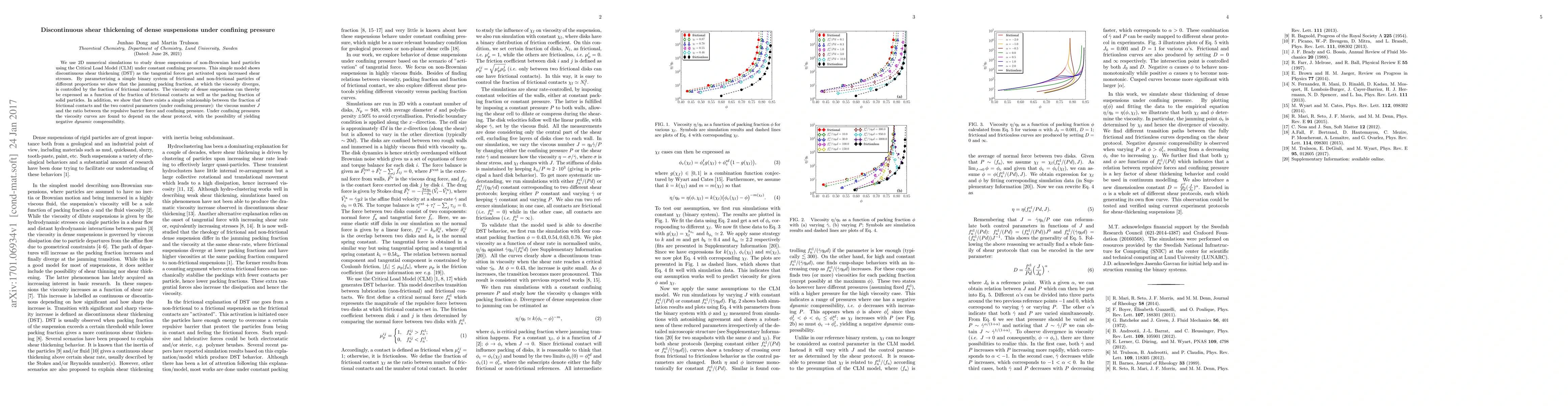 This paper uses numerical simulations to explore dense suspensions of hard particles under constant confining pressure, revealing discontinuous shear thickening driven by increased shear stresses. The study finds that the jamming packing fraction and viscosity are influenced by the proportion of frictional contacts, establishing a relationship between frictional contacts and control parameters like the viscous number and force ratios.