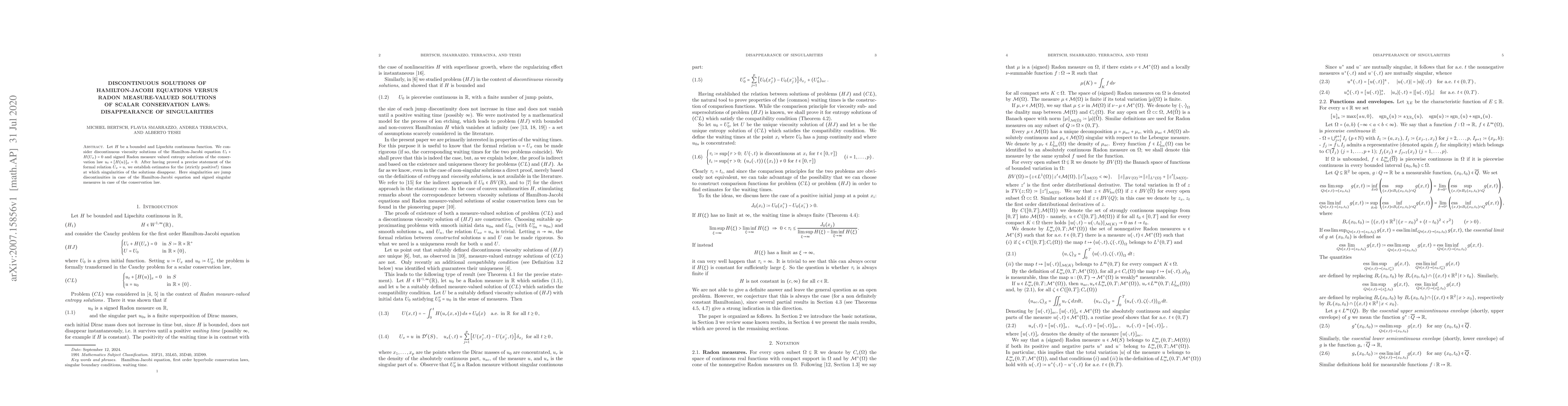 This paper investigates the relationship between discontinuous viscosity solutions of Hamilton-Jacobi equations and Radon measure-valued solutions of scalar conservation laws, demonstrating how singularities in both types of solutions can disappear over time. It establishes precise estimates for the times at which these singularities vanish.
