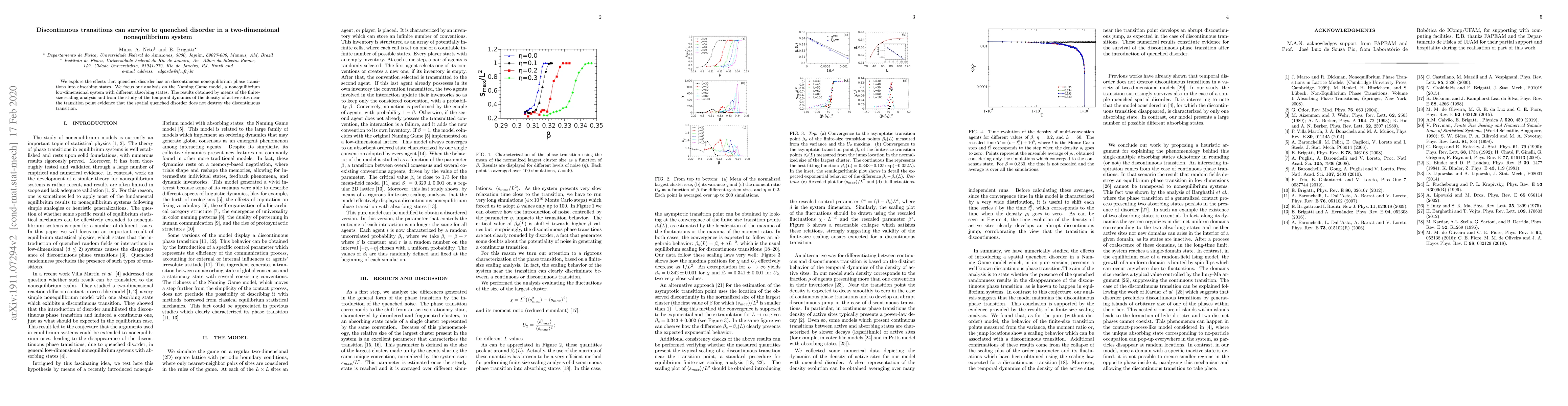 This study investigates how quenched disorder affects discontinuous nonequilibrium phase transitions in the Naming Game model, revealing that spatial disorder does not disrupt the transition despite the system's absorbing states. The findings are supported by finite-size scaling and analysis of active site dynamics.