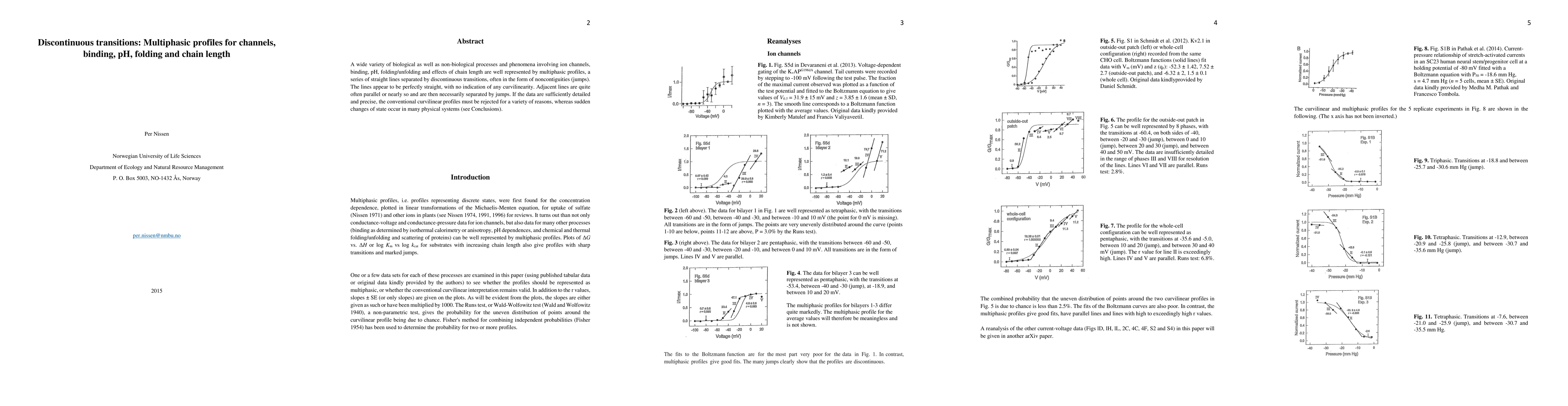 A wide variety of biological as well as non-biological processes and phenomena involving ion channels, binding, pH, folding/unfolding and effects of chain length are well represented by multiphasic profiles, a series of straight lines separated by discontinuous transitions, often in the form of noncontiguities (jumps). The lines appear to be perfectly straight, with no indication of any curvilinearity. Adjacent lines are quite often parallel or nearly so and are then necessarily separated by jumps. If the data are sufficiently detailed and precise, the conventional curvilinear profiles must be rejected for a variety of reasons, whereas sudden changes of state occur in many physical systems (see Conclusions).
