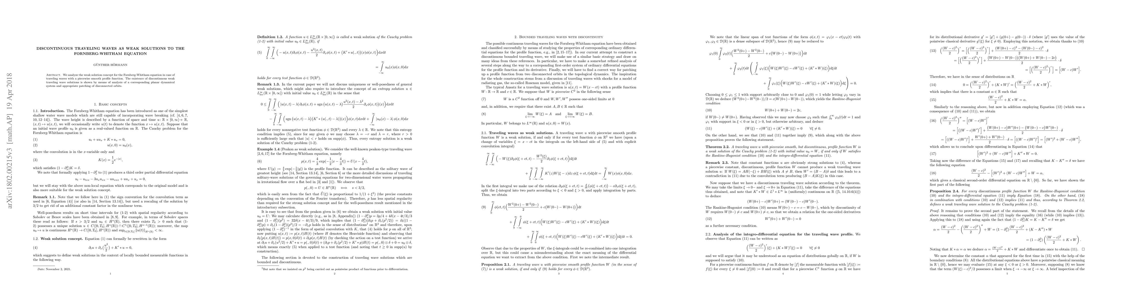 This paper investigates the existence of discontinuous weak traveling wave solutions for the Fornberg-Whitham equation, demonstrating their existence through the analysis of a planar dynamical system and the patching of disconnected orbits.