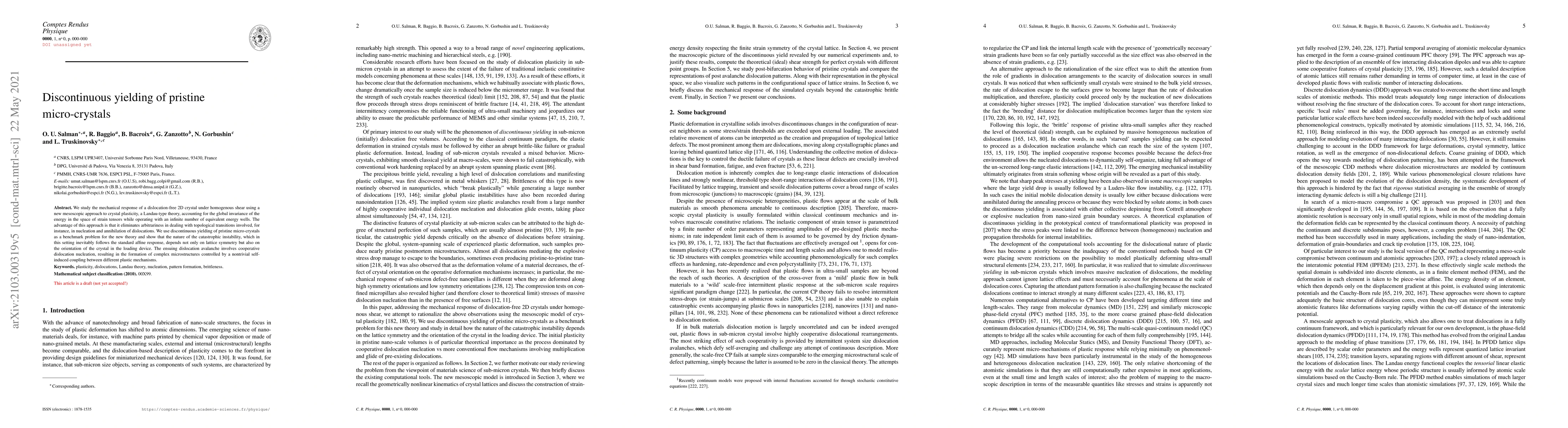 We study the mechanical response of a dislocation-free 2D crystal under homogenous shear using a new mesoscopic approach to crystal plasticity, a Landau-type theory, accounting for the global invariance of the energy in the space of strain tensors while operating with an infinite number of equivalent energy wells. The advantage of this approach is that it eliminates arbitrariness in dealing with topological transitions involved, for instance, in nucleation and annihilation of dislocations. We use discontinuous yielding of pristine micro-crystals as a benchmark problem for the new theory and show that the nature of the catastrophic instability, which in this setting inevitably follows the standard affine response, depends not only on lattice symmetry but also on the orientation of the crystal in the loading device. The ensuing dislocation avalanche involves cooperative dislocation nucleation, resulting in the formation of complex microstructures controlled by a nontrivial self-induced coupling between different plastic mechanisms.