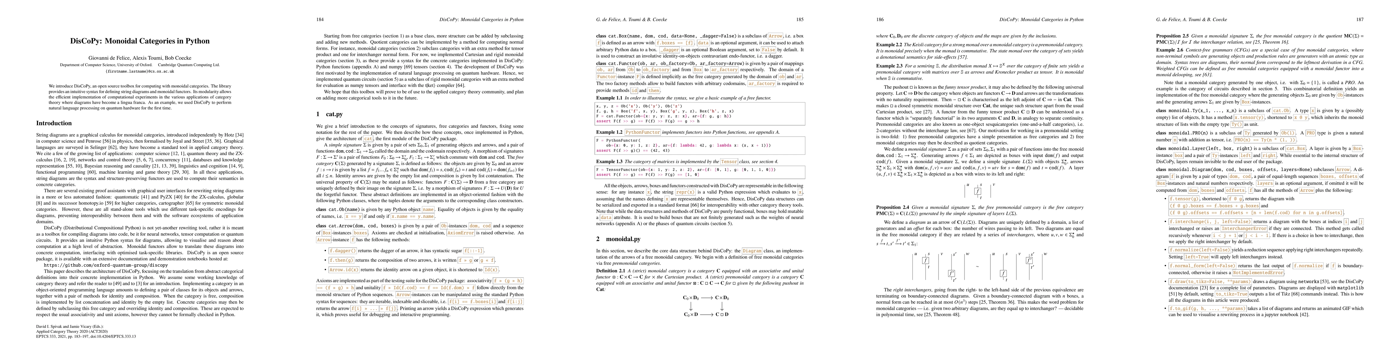 DisCoPy is an open-source toolbox for working with monoidal categories in Python, offering an intuitive syntax for string diagrams and monoidal functors. It enables efficient computational experiments in category theory applications, exemplified by its use in natural language processing on quantum hardware.