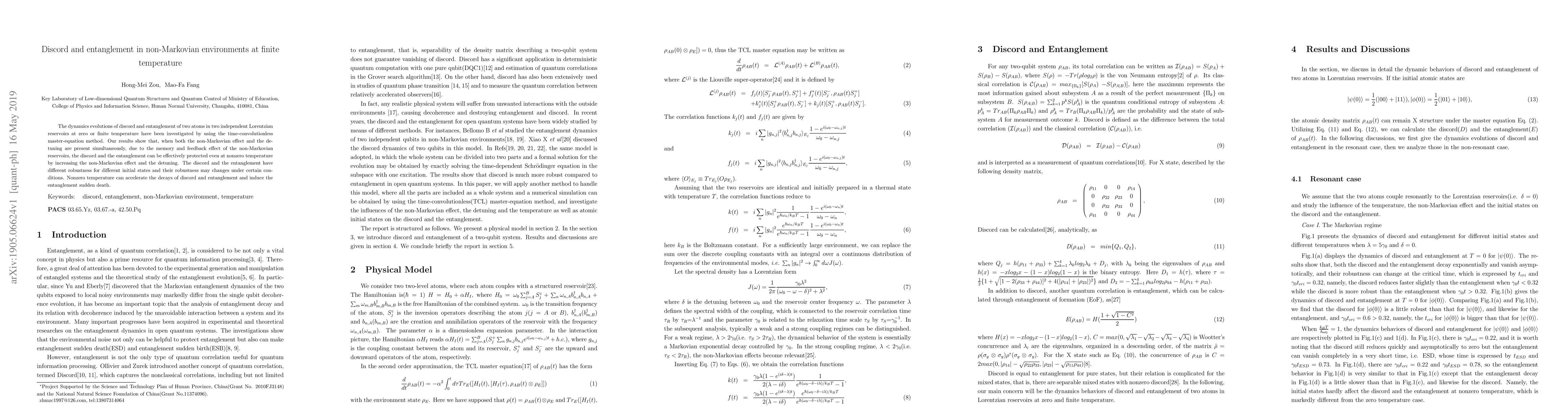 The dynamics evolutions of discord and entanglement of two atoms in two independent Lorentzian reservoirs at zero or finite temperature have been investigated by using the time-convolutionless master-equation method. Our results show that, when both the non-Markovian effect and the detuning are present simultaneously, due to the memory and feedback effect of the non-Markovian reservoirs, the discord and the entanglement can be effectively protected even at nonzero temperature by increasing the non-Markovian effect and the detuning. The discord and the entanglement have different robustness for different initial states and their robustness may changes under certain conditions. Nonzero temperature can accelerate the decays of discord and entanglement and induce the entanglement sudden death.