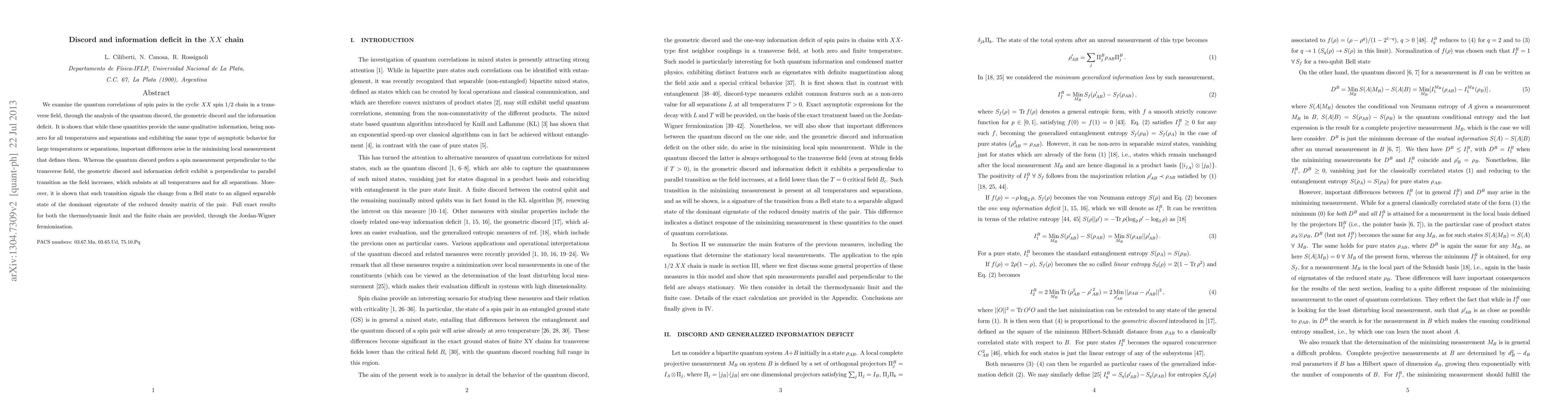 This paper investigates quantum correlations in the XX spin chain under a transverse field by analyzing quantum discord, geometric discord, and information deficit. While these measures share similar qualitative behaviors, they differ in their optimal measurement strategies, with quantum discord favoring perpendicular spin measurements, and geometric discord and information deficit transitioning from perpendicular to parallel as the field increases, signaling a shift from a Bell state to an aligned separable state.