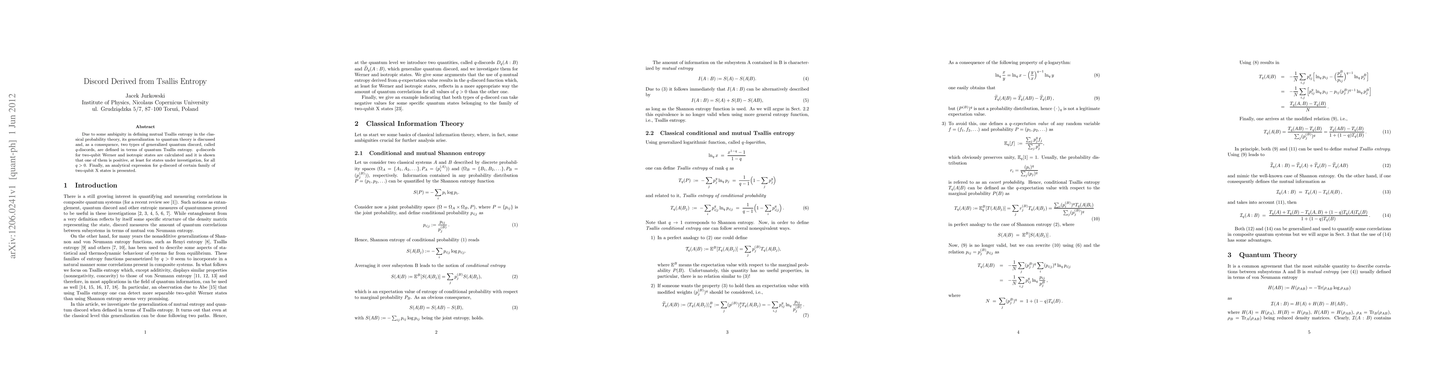 This paper generalizes mutual Tsallis entropy to quantum theory, defining two types of quantum discord, termed $q$-discords. It calculates $q$-discords for two-qubit Werner and isotropic states, demonstrating that one type remains positive for all $q>0$, and provides an analytical expression for $q$-discord in a specific family of two-qubit X states.