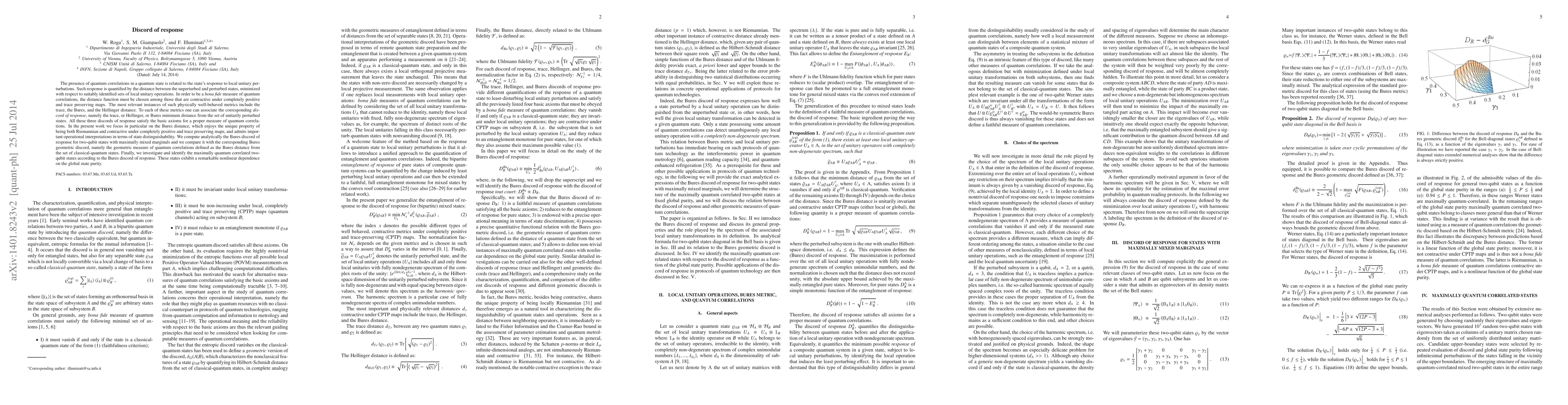 The presence of quantum correlations in a quantum state is related to the state response to local unitary perturbations. Such response is quantified by the distance between the unperturbed and perturbed states, minimized with respect to suitably identified sets of local unitary operations. In order to be a bona fide measure of quantum correlations, the distance function must be chosen among those that are contractive under completely positive and trace preserving maps. The most relevant instances of such physically well behaved metrics include the trace, the Bures, and the Hellinger distance. To each of these metrics one can associate the corresponding discord of response, namely the trace, or Hellinger, or Bures minimum distance from the set of unitarily perturbed states. All these three discords of response satisfy the basic axioms for a proper measure of quantum correlations. In the present work we focus in particular on the Bures distance, which enjoys the unique property of being both Riemannian and contractive under completely positive and trace preserving maps, and admits important operational interpretations in terms of state distinguishability. We compute analytically the Bures discord of response for two-qubit states with maximally mixed marginals and we compare it with the corresponding Bures geometric discord, namely the geometric measure of quantum correlations defined as the Bures distance from the set of classically correlated quantum states. Finally, we investigate and identify the maximally quantum correlated two-qubit states according to the Bures discord of response. These states exhibit a remarkable nonlinear dependence on the global state purity.