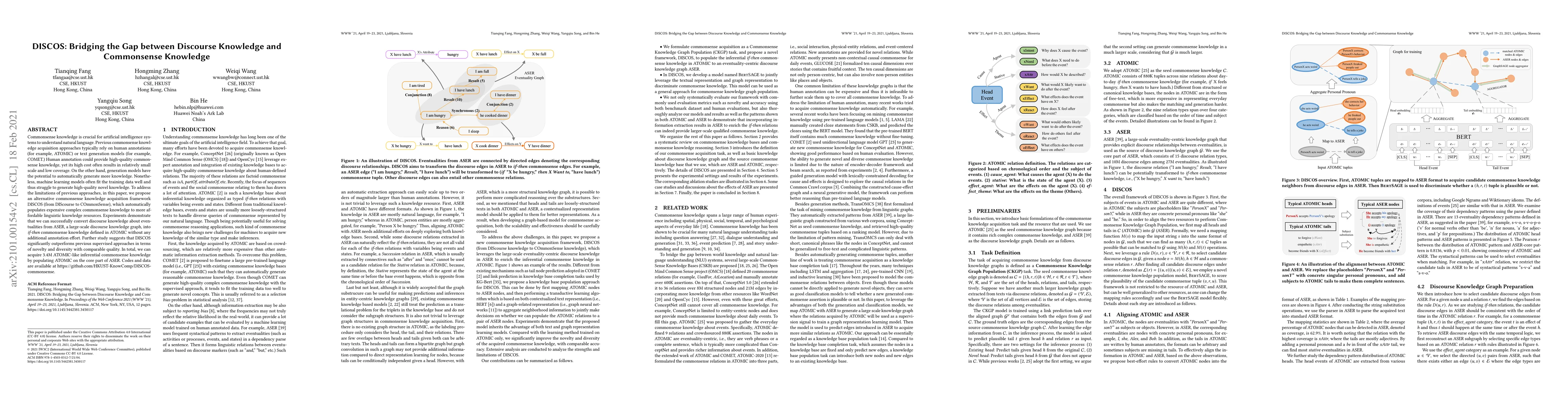 The paper introduces DISCOS, a framework that bridges discourse knowledge and commonsense knowledge to automatically generate large-scale commonsense knowledge without extensive human annotation. Experiments show that DISCOS can convert discourse knowledge from ASER into ATOMIC-like commonsense rules, achieving high novelty and diversity while maintaining comparable quality.