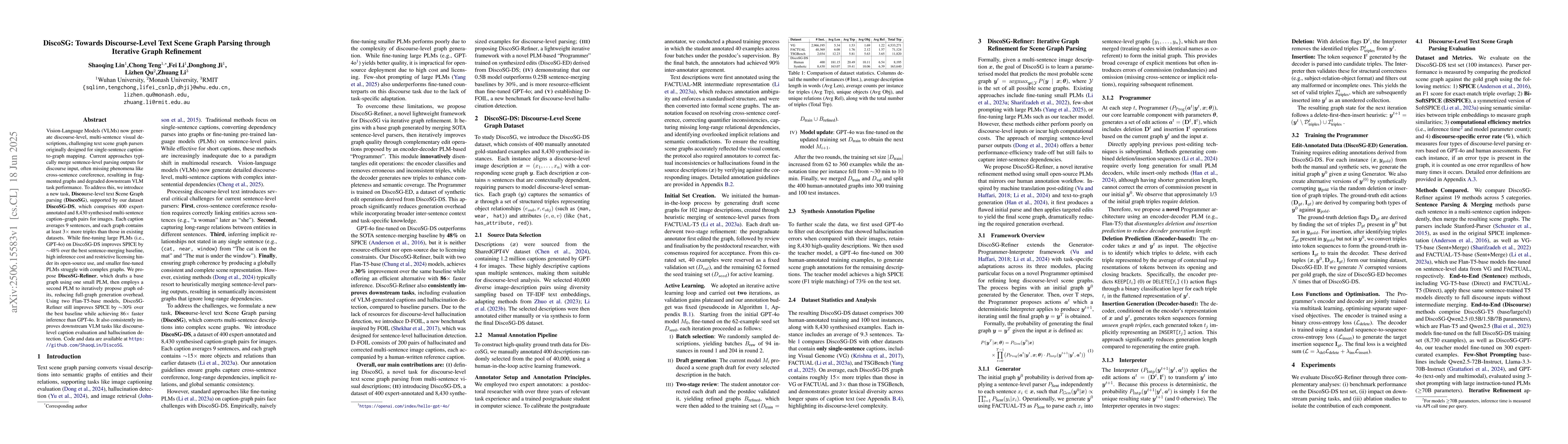 Vision-Language Models (VLMs) now generate discourse-level, multi-sentence visual descriptions, challenging text scene graph parsers originally designed for single-sentence caption-to-graph mapping. Current approaches typically merge sentence-level parsing outputs for discourse input, often missing phenomena like cross-sentence coreference, resulting in fragmented graphs and degraded downstream VLM task performance. To address this, we introduce a new task, Discourse-level text Scene Graph parsing (DiscoSG), supported by our dataset DiscoSG-DS, which comprises 400 expert-annotated and 8,430 synthesised multi-sentence caption-graph pairs for images. Each caption averages 9 sentences, and each graph contains at least 3 times more triples than those in existing datasets. While fine-tuning large PLMs (i.e., GPT-4) on DiscoSG-DS improves SPICE by approximately 48% over the best sentence-merging baseline, high inference cost and restrictive licensing hinder its open-source use, and smaller fine-tuned PLMs struggle with complex graphs. We propose DiscoSG-Refiner, which drafts a base graph using one small PLM, then employs a second PLM to iteratively propose graph edits, reducing full-graph generation overhead. Using two Flan-T5-Base models, DiscoSG-Refiner still improves SPICE by approximately 30% over the best baseline while achieving 86 times faster inference than GPT-4. It also consistently improves downstream VLM tasks like discourse-level caption evaluation and hallucination detection. Code and data are available at: https://github.com/ShaoqLin/DiscoSG