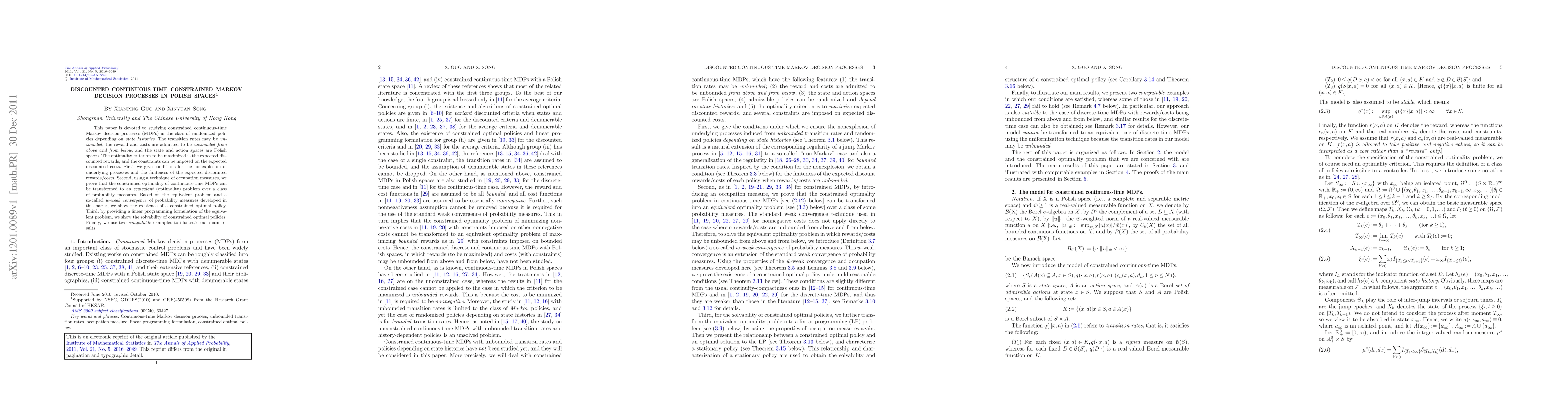 This paper is devoted to studying constrained continuous-time Markov decision processes (MDPs) in the class of randomized policies depending on state histories. The transition rates may be unbounded, the reward and costs are admitted to be unbounded from above and from below, and the state and action spaces are Polish spaces. The optimality criterion to be maximized is the expected discounted rewards, and the constraints can be imposed on the expected discounted costs. First, we give conditions for the nonexplosion of underlying processes and the finiteness of the expected discounted rewards/costs. Second, using a technique of occupation measures, we prove that the constrained optimality of continuous-time MDPs can be transformed to an equivalent (optimality) problem over a class of probability measures. Based on the equivalent problem and a so-called $\bar{w}$-weak convergence of probability measures developed in this paper, we show the existence of a constrained optimal policy. Third, by providing a linear programming formulation of the equivalent problem, we show the solvability of constrained optimal policies. Finally, we use two computable examples to illustrate our main results.