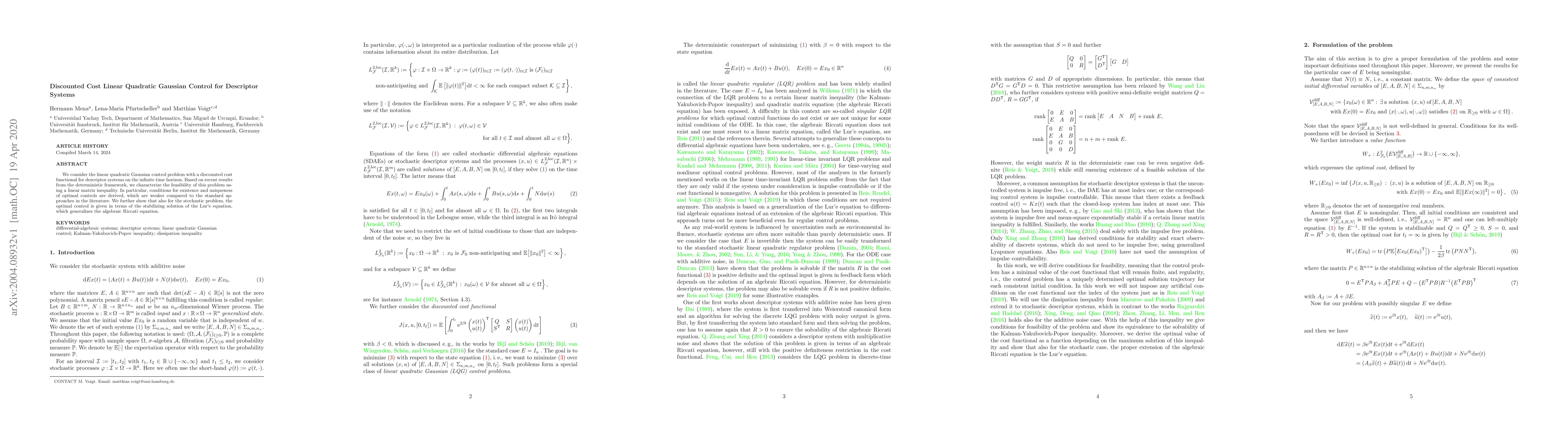 This paper addresses the discounted cost linear quadratic Gaussian control problem for descriptor systems, deriving conditions for the existence and uniqueness of optimal controls using a linear matrix inequality. It shows that the optimal control is linked to the stabilizing solution of the Lur'e equation, offering a generalization of the algebraic Riccati equation.
