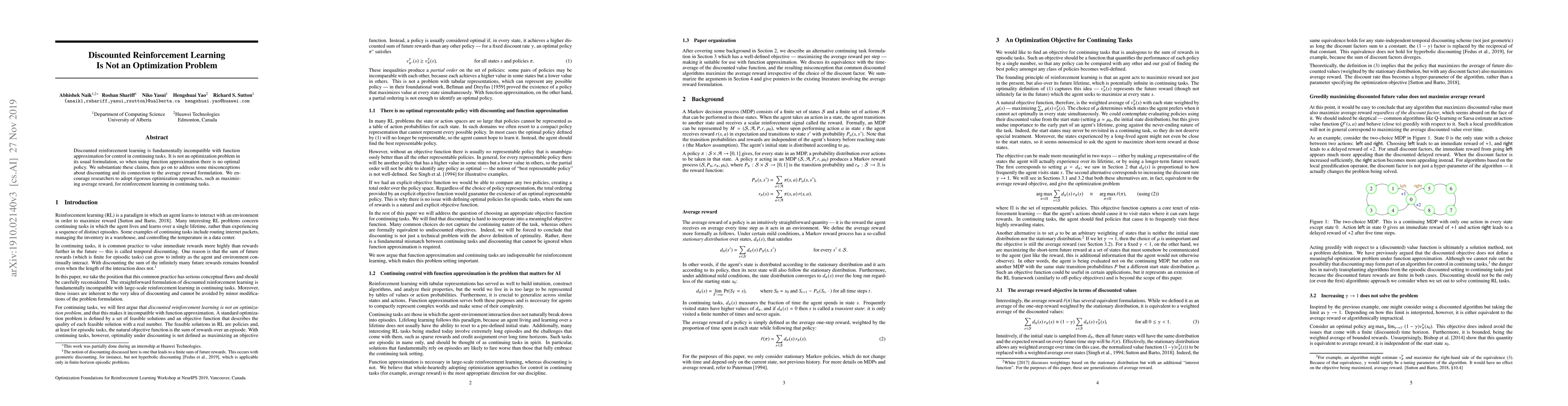 Discounted reinforcement learning is not an optimization problem when using function approximation for control in continuing tasks. Using average reward maximization instead can lead to optimal policies.