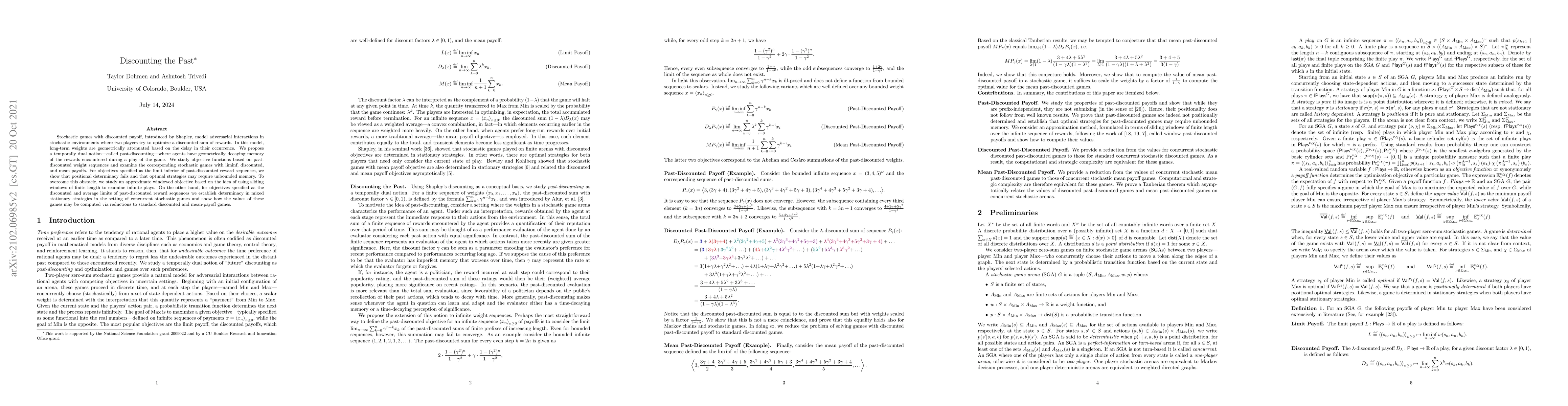 Stochastic games with discounted payoff, introduced by Shapley, model adversarial interactions in stochastic environments where two players try to optimize a discounted sum of rewards. In this model, long-term weights are geometrically attenuated based on the delay in their occurrence. We propose a temporally dual notion -- called past-discounting -- where agents have geometrically decaying memory of the rewards encountered during a play of the game. We study objective functions based on past-discounted weight sequences and examine the corresponding stochastic games with liminf, discounted, and mean payoffs. For objectives specified as the limit inferior of past-discounted reward sequences, we show that positional determinacy fails and that optimal strategies may require unbounded memory. To overcome this obstacle, we study an approximate windowed objective based on the idea of using sliding windows of finite length to examine infinite plays. On the other hand, for objectives specified as the discounted and average limits of past-discounted reward sequences we establish determinacy in mixed stationary strategies in the setting of concurrent stochastic games and show how the values of these games may be computed via reductions to standard discounted and mean-payoff games.